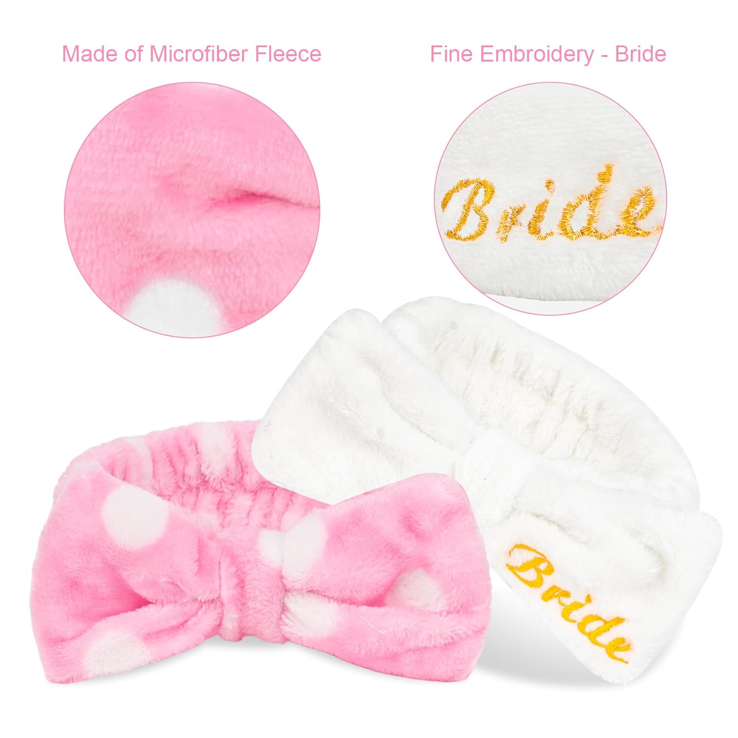 - Material: Comfortable elastic texture, microfiber wool, very soft, comfortable to wear. A white spa headband with "bride" embroidery is perfect for your bachelorette party with friends.