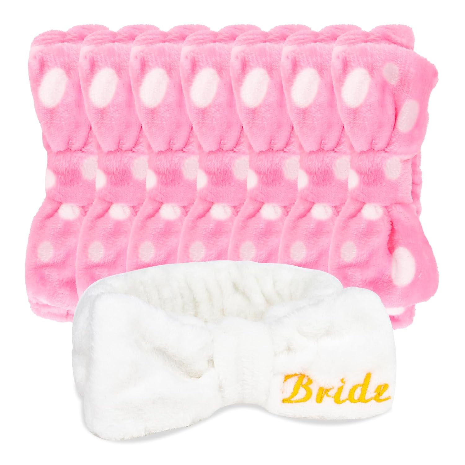 - The perfect bachelorette themed party favors: 1 white bridal spa headband +7 pink dot bridesmaid spa headbands.