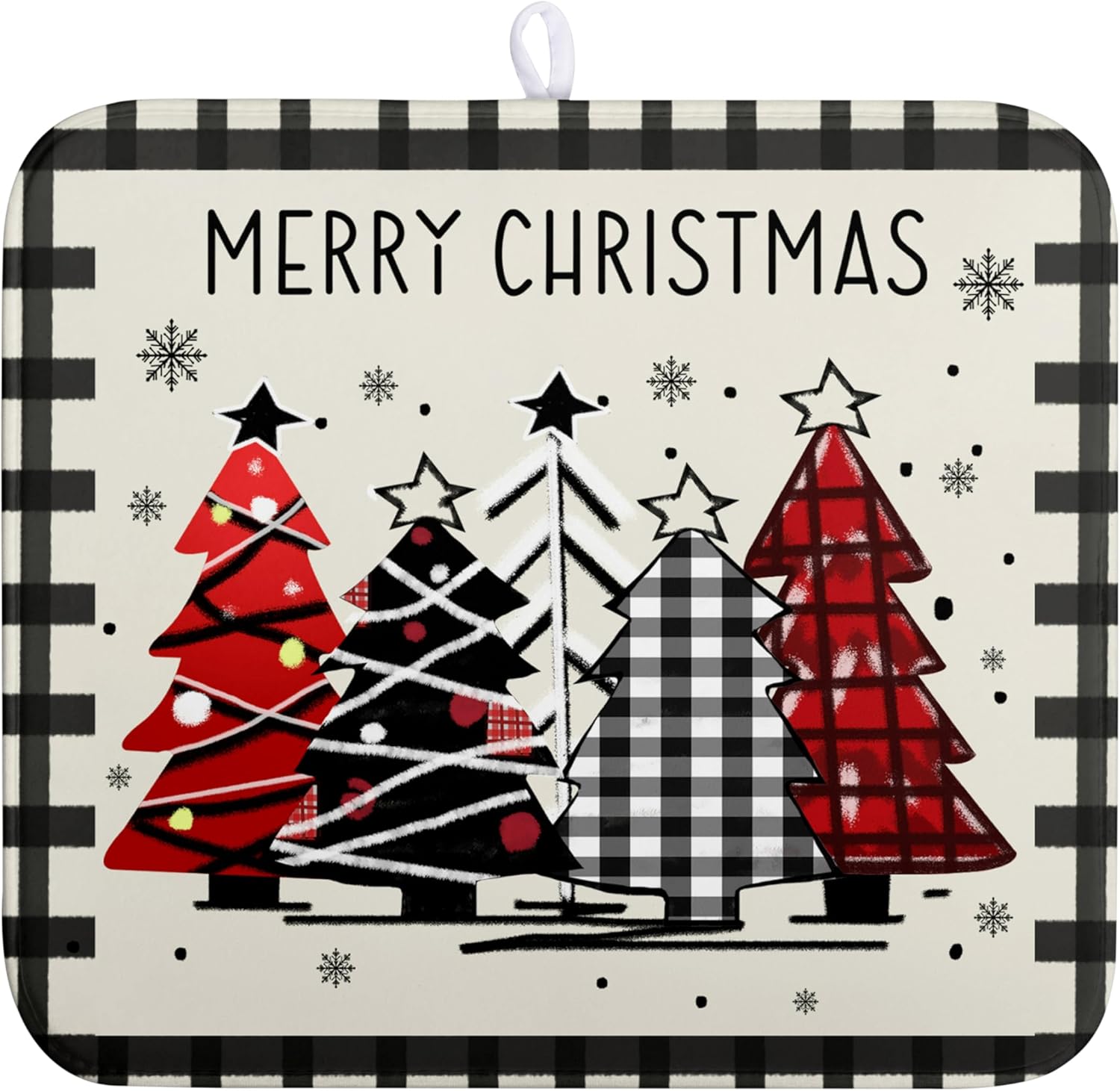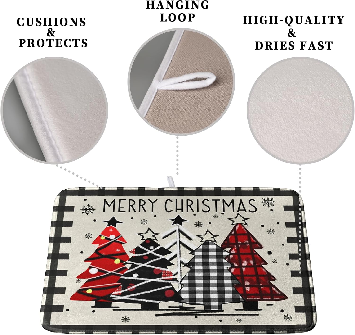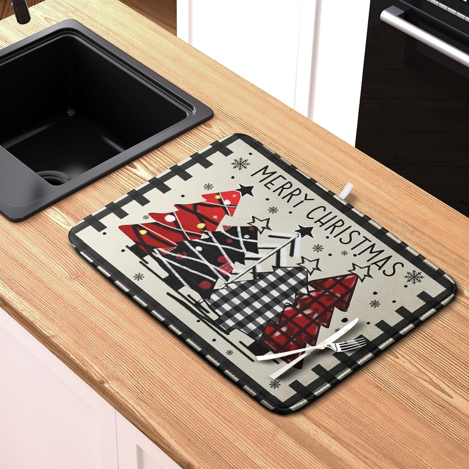 Merry Christmas Dish Drying Mats for Kitchen Counter 16x18 Buffalo Plaid Christmas Tree Microfiber Absorbent Drying Mat Seasonal Winter Holiday Drying Pad Dish Drainer Mat for Coffee Bar Sinks