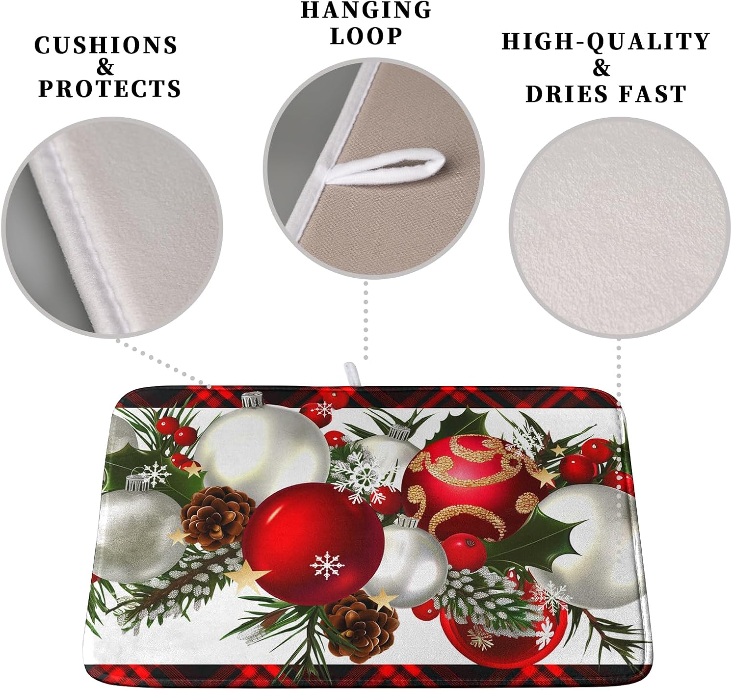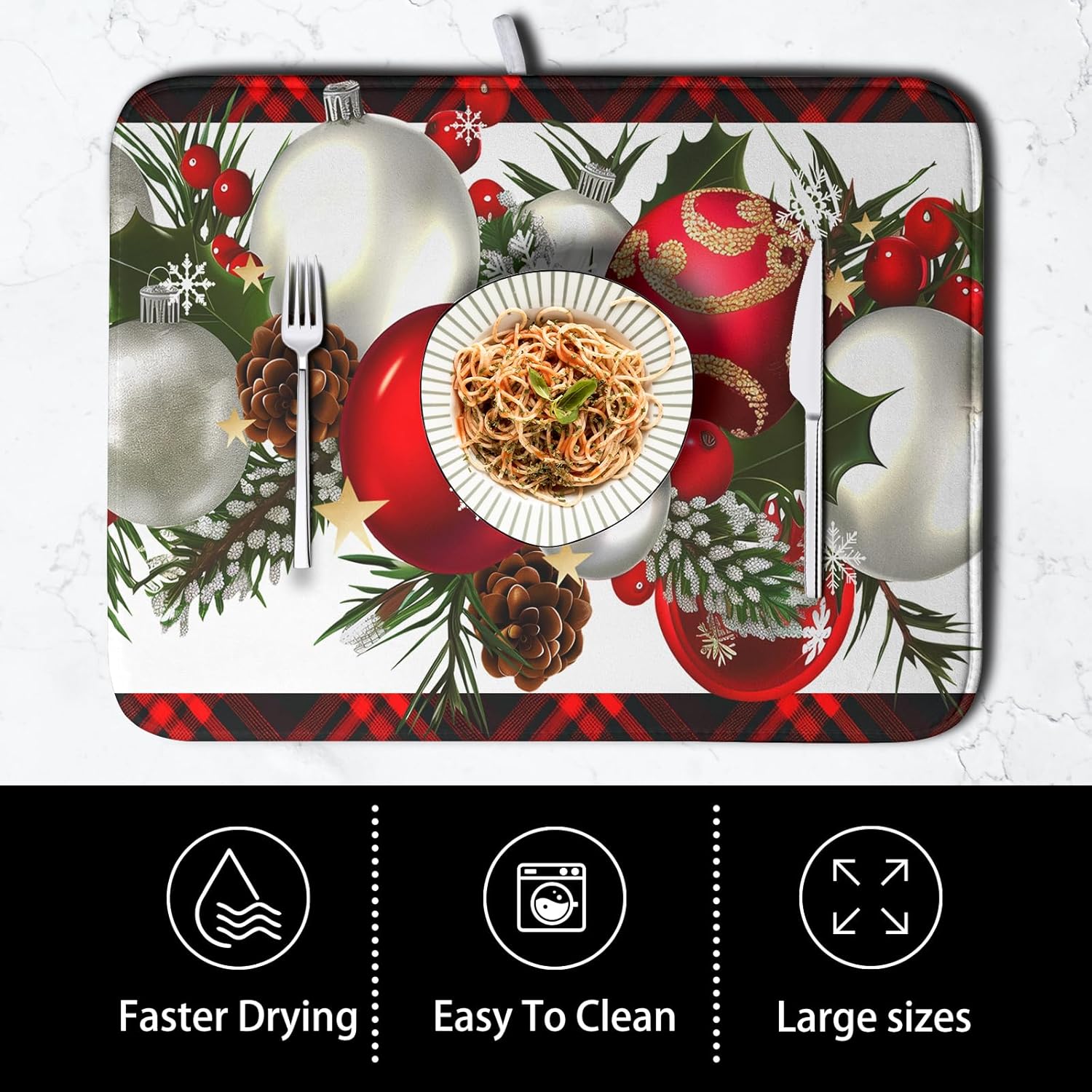 Christmas Red Buffalo Plaid Dish Drying Mat for Kitchen Counter 16x18 Inch Winter Xmas Ball Snowflake Pine Cones Dishes Drying Mat Microfibe Super Absorbent Dish Rack Pad for Coffee Bar Sinks