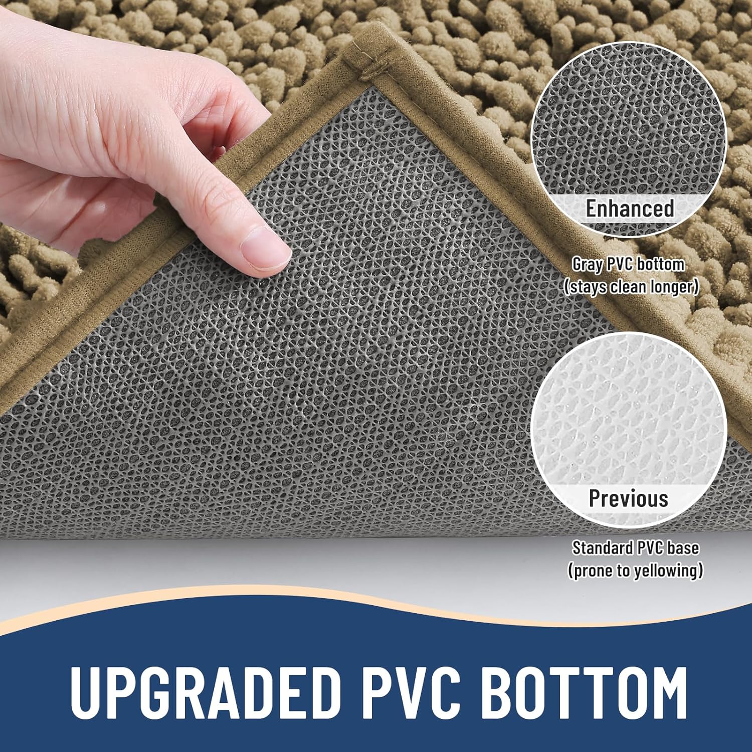 - Anti-Skid Backing: Arotive chenille bathroom rugs feature a non-slip bottom consisting of sturdy mesh PVC material that stops the bath mat from shifting and skidding. The middle layer is 4 mm memory foam, which can let you feel more comfortable when wrapping into the rugs. WARNING: Place bath mat on CLEAN DRY FLAT FLOOR ONLY. Water under bath rug can cause it to slip. Always keep the bottom of bath rug dry
