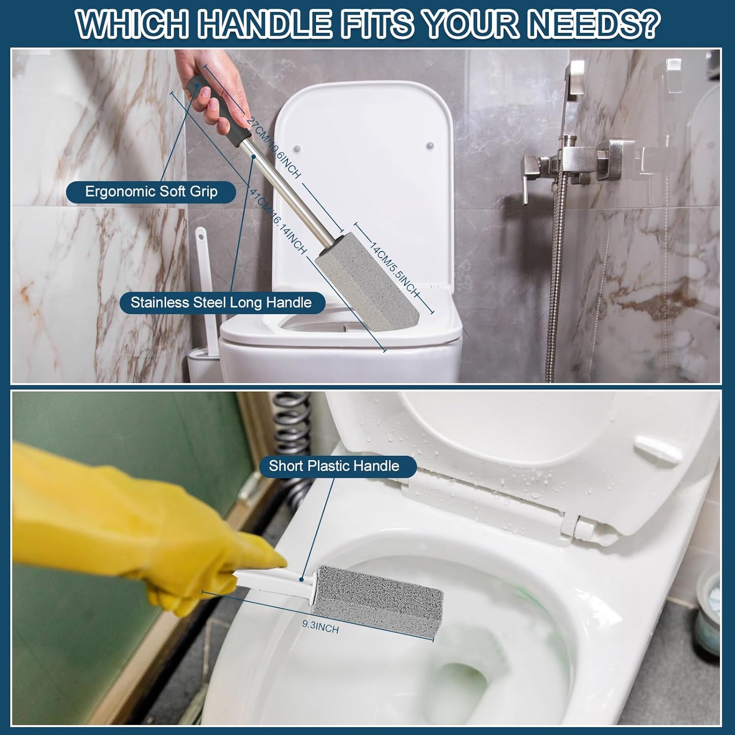 - Stainless Steel and Soft Grip Handle:The pumice stone toilet bowl cleaner is made of stainless steel handle that is stronger than traditional plastic toilet brushes,Meanwhile,the soft plastic sponge handle gives you a comfortable feeling and just perfect size for you hold when using