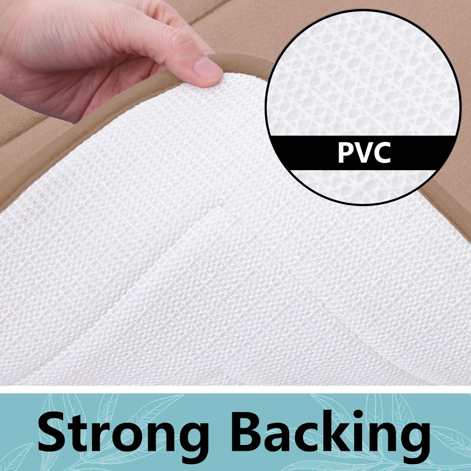 - PVC Backing : Our bath mat features a non-slip backing made from good quality mesh PVC that helps ensure you and your family stay secure. WARNING: Place mat on CLEAN DRY SMOOTH FLOOR only. Water under bath mats can cause it to slip. Keep bottom of mat dry. Before using bath carpet, test with foot to ensure it doesn't move