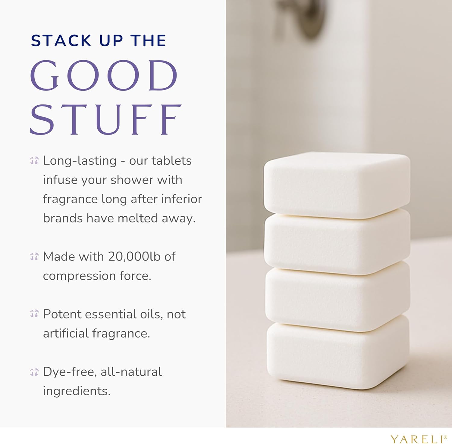 - Long Lasting - In testing, our tablets last over twice as long as leading competetiors, on average 2 showers, due to being made with 20,000 pounds of compression force. The strength of each tablet ensures they arrive to your doorstop undamaged
