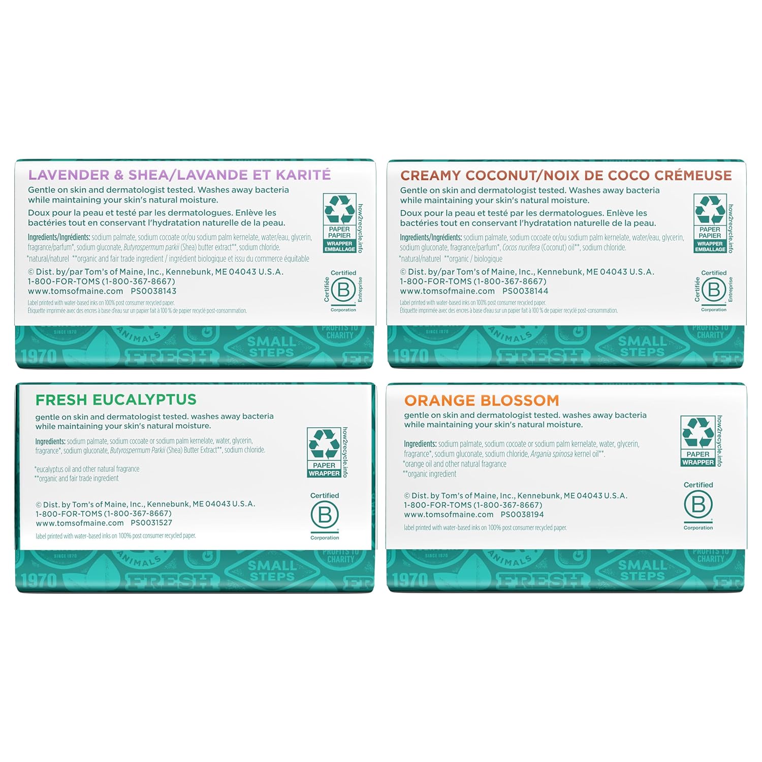 - WHAT’S INCLUDED: This 4-pack of Tom’s of Maine Bar Soap includes a variety of scents, including Lavender & Shea, Fresh Eucalyptus, Creamy Coconut, and Orange Blossom