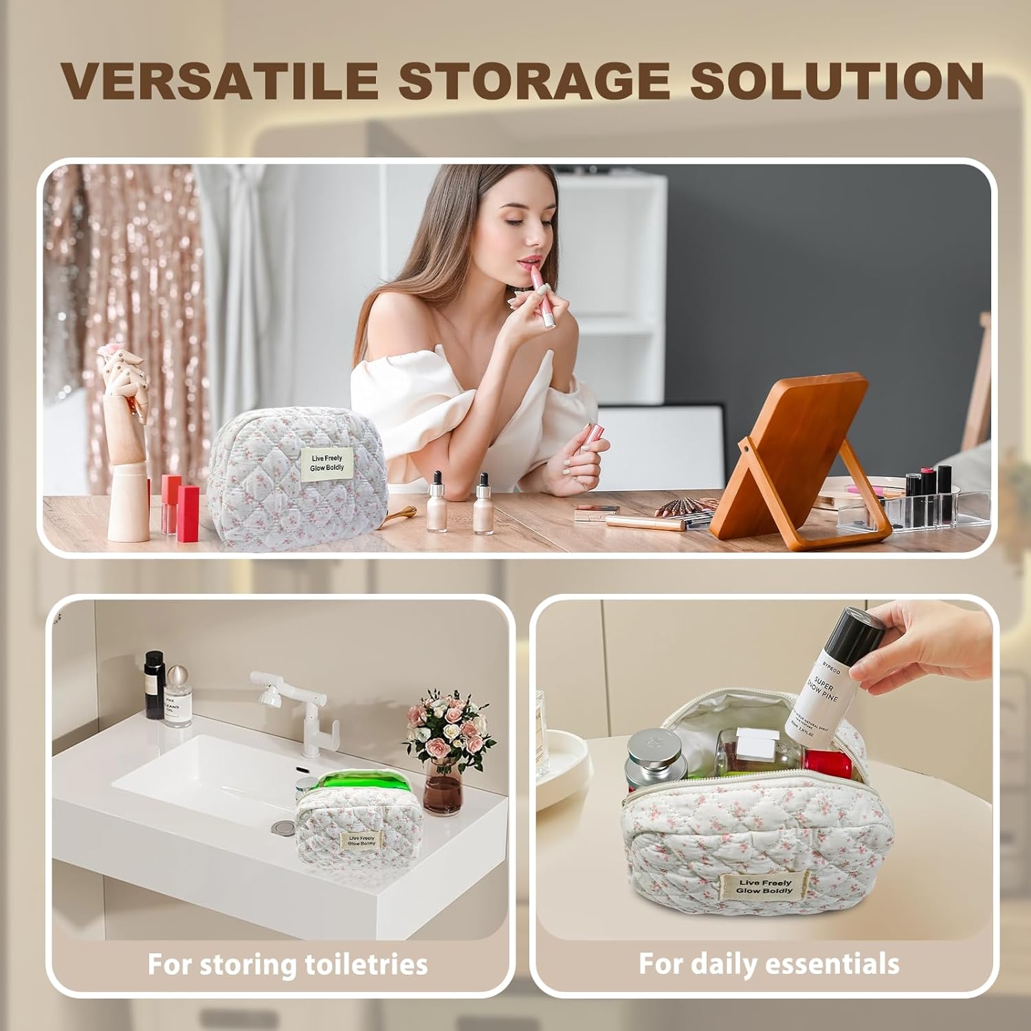 3Pcs Large Travel Quilted Makeup Bag, Double Layer Cute Floral Cotton Toiletry Bag, Aesthetic Flower Cosmetic Bag Coquette Skincare Organizer Bag for Wome (74-PinkFloral)