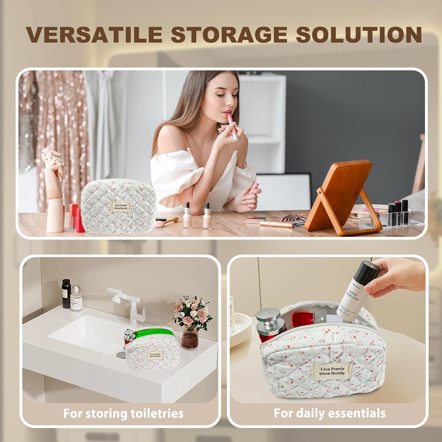 - Set of 3 Pieces: The set includes three cosmetic bags in varying sizes for versatile use.. T9.45×7.10×6.30 inches, 9.45×6.70×3.55 inches, and 7.85×5.50×3.15 inches respectively, our cute quilted makeup bags are perfectly sized for portability.