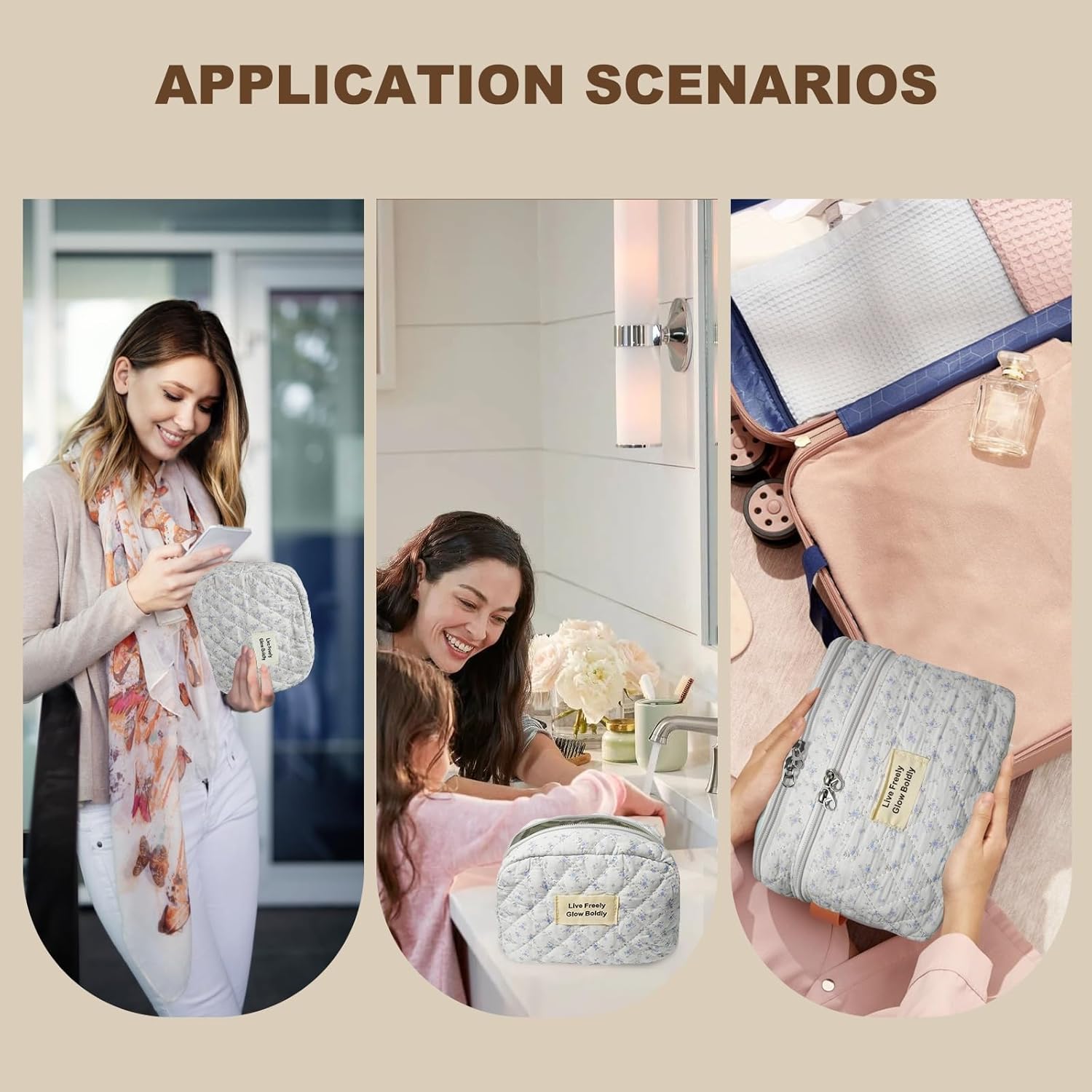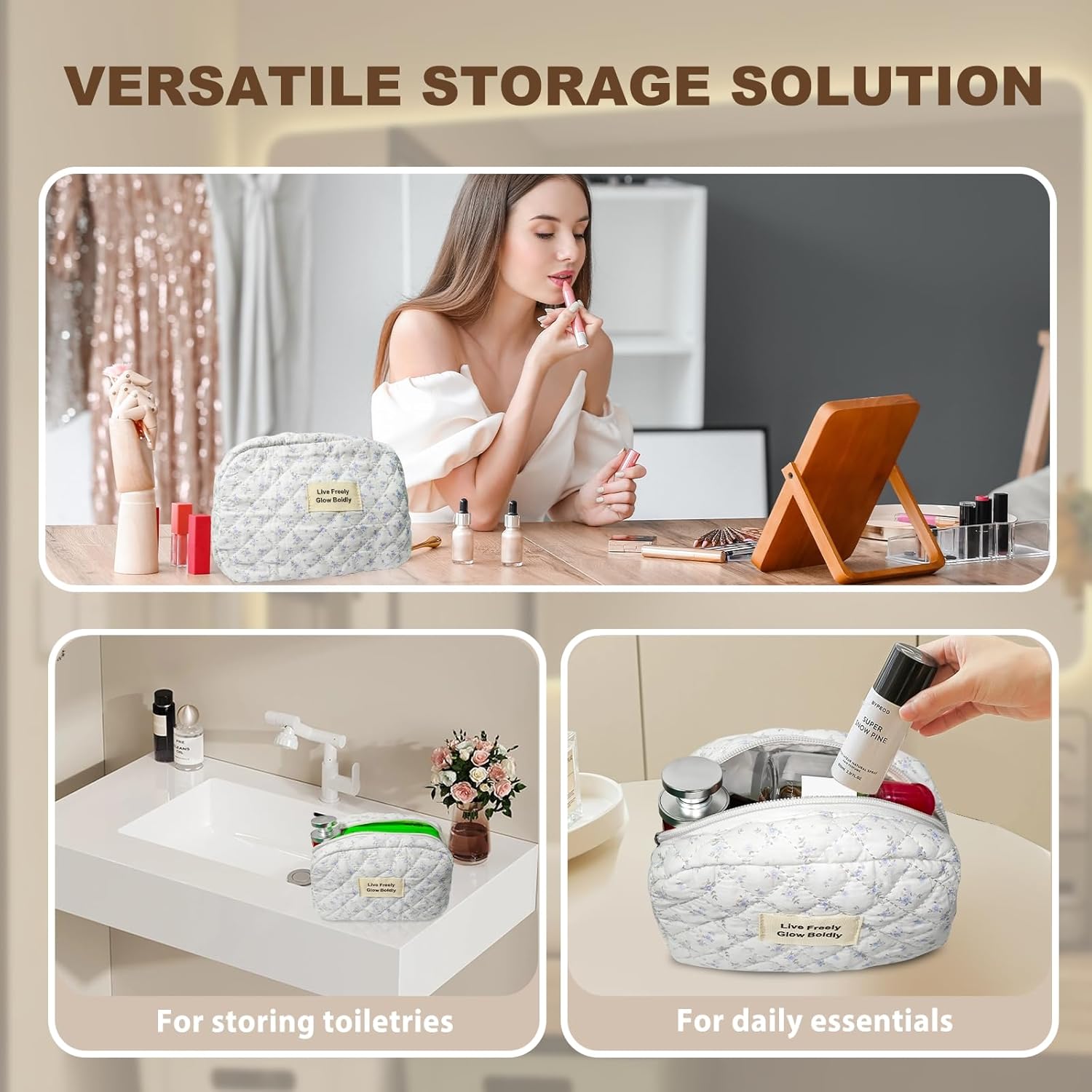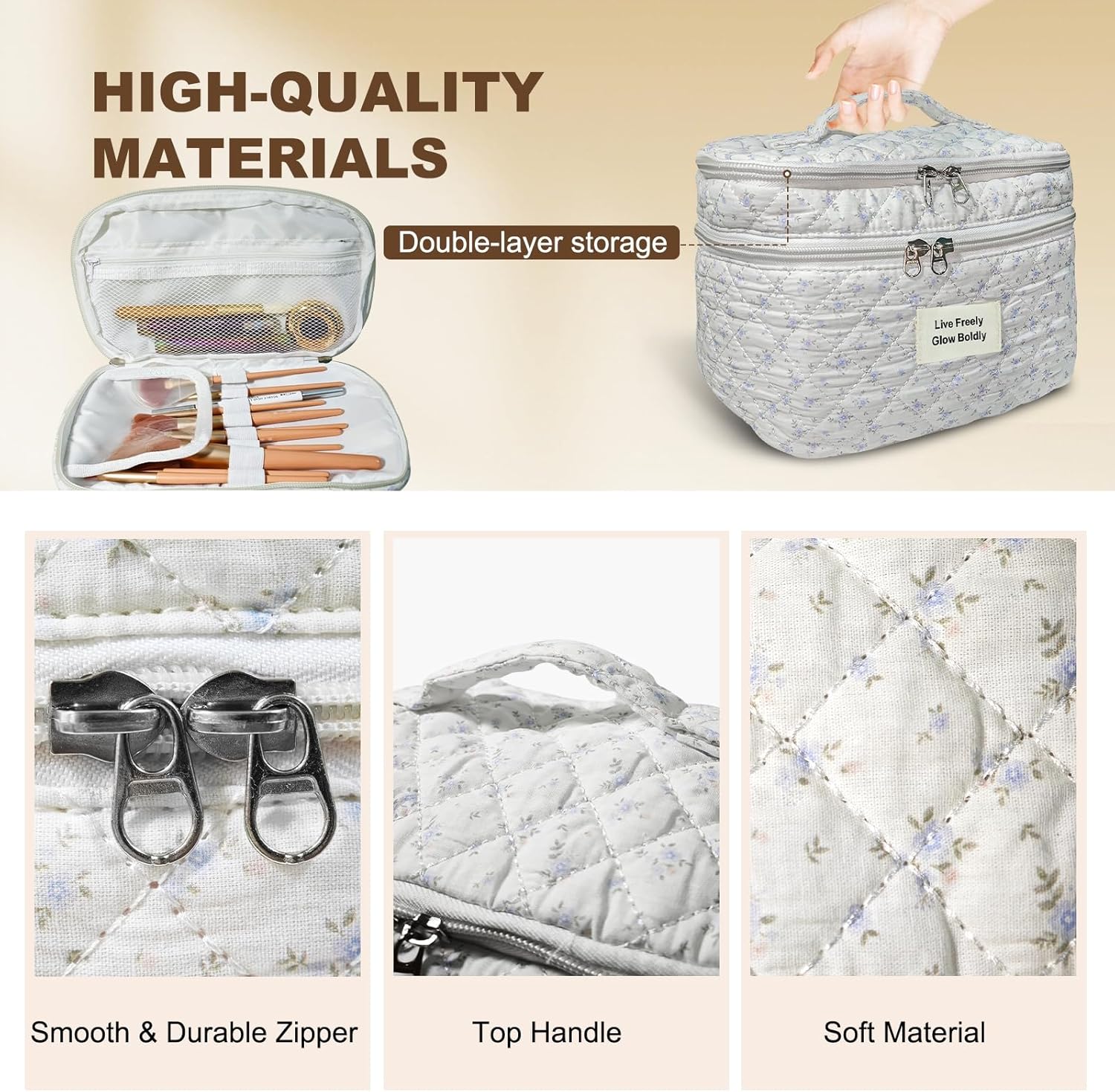 3Pcs Large Travel Quilted Makeup Bag, Double Layer Cute Floral Cotton Toiletry Bag, Aesthetic Flower Cosmetic Bag Coquette Skincare Organizer Bag for Women (77-BlueFloral)