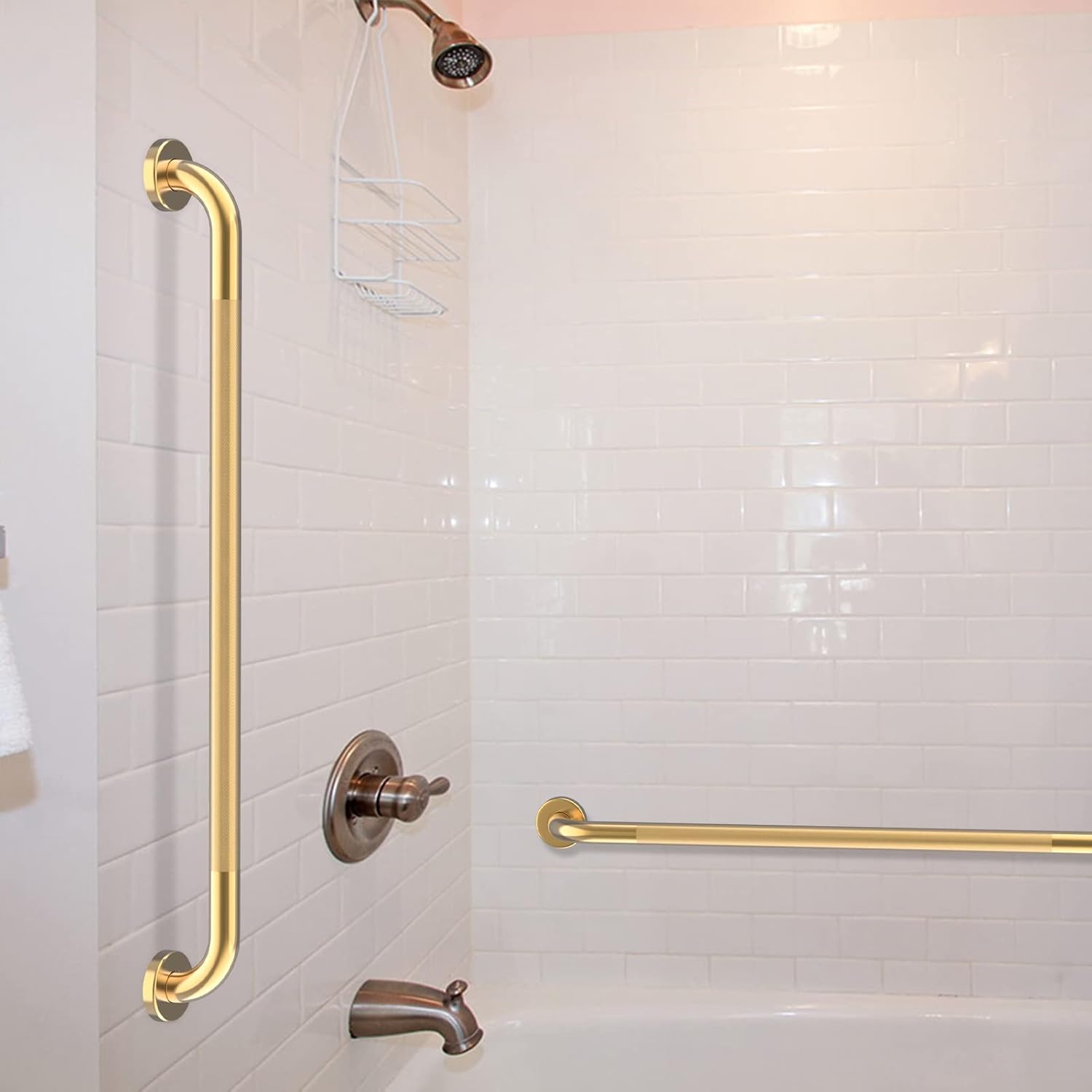 - Use 32 inch anti slip Oil Rubbed gold knurled safety grab bars in the bathroom, kitchen, along stairways, or in the laundry room for additional fall prevention, especially for the handicap, elderly, pregnant women, and children. Not only apply to use as bath shower grab bar, but also can hold clothing,etc.