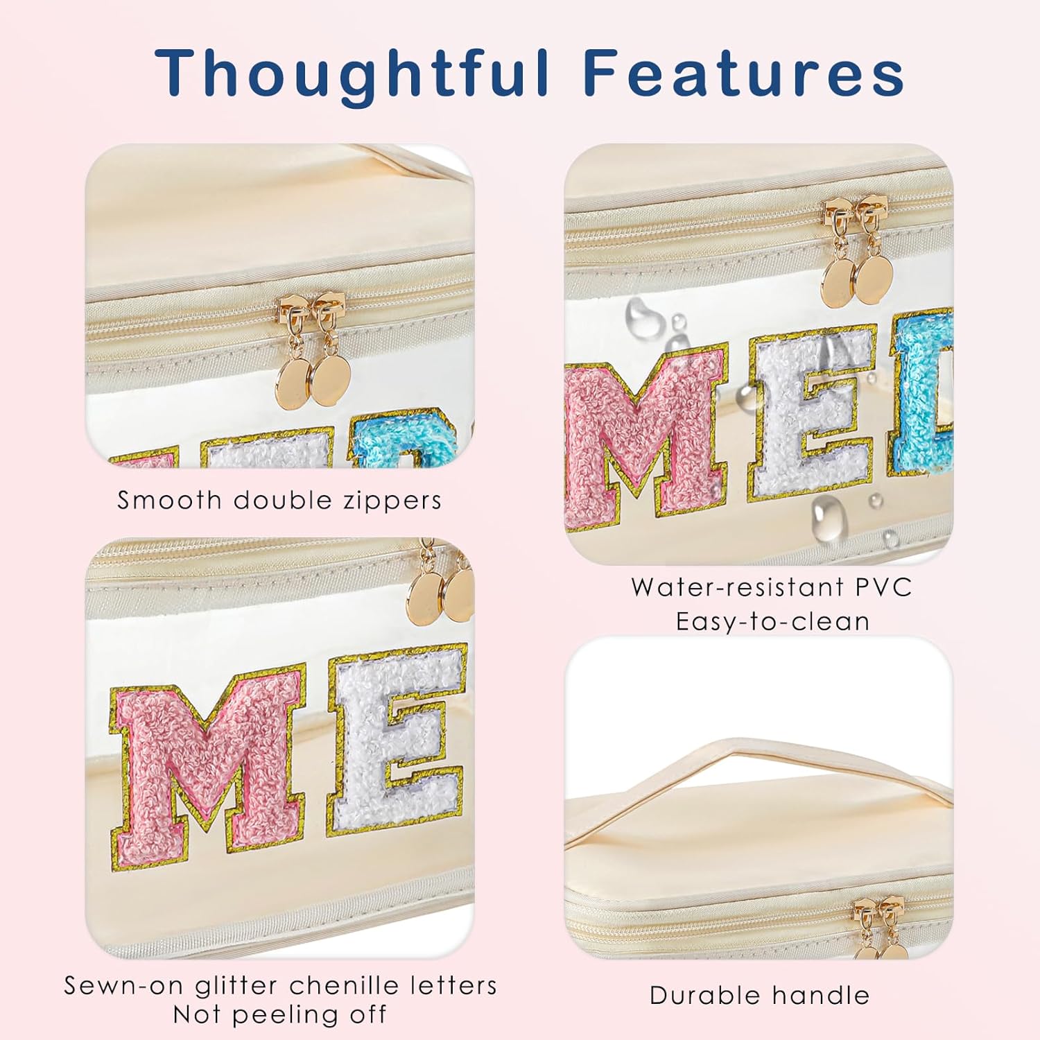 - [Sewn-on Letters]: Our chenille letter bag is made of good quality and thick nylon material, Colorful preppy chenille letters sewn firmly on the transparentbag, lightweight and durable, waterproof and reusable, which is easy to clean and not easy to break, it can serve you for a long time and provide you with a nice using experience.
