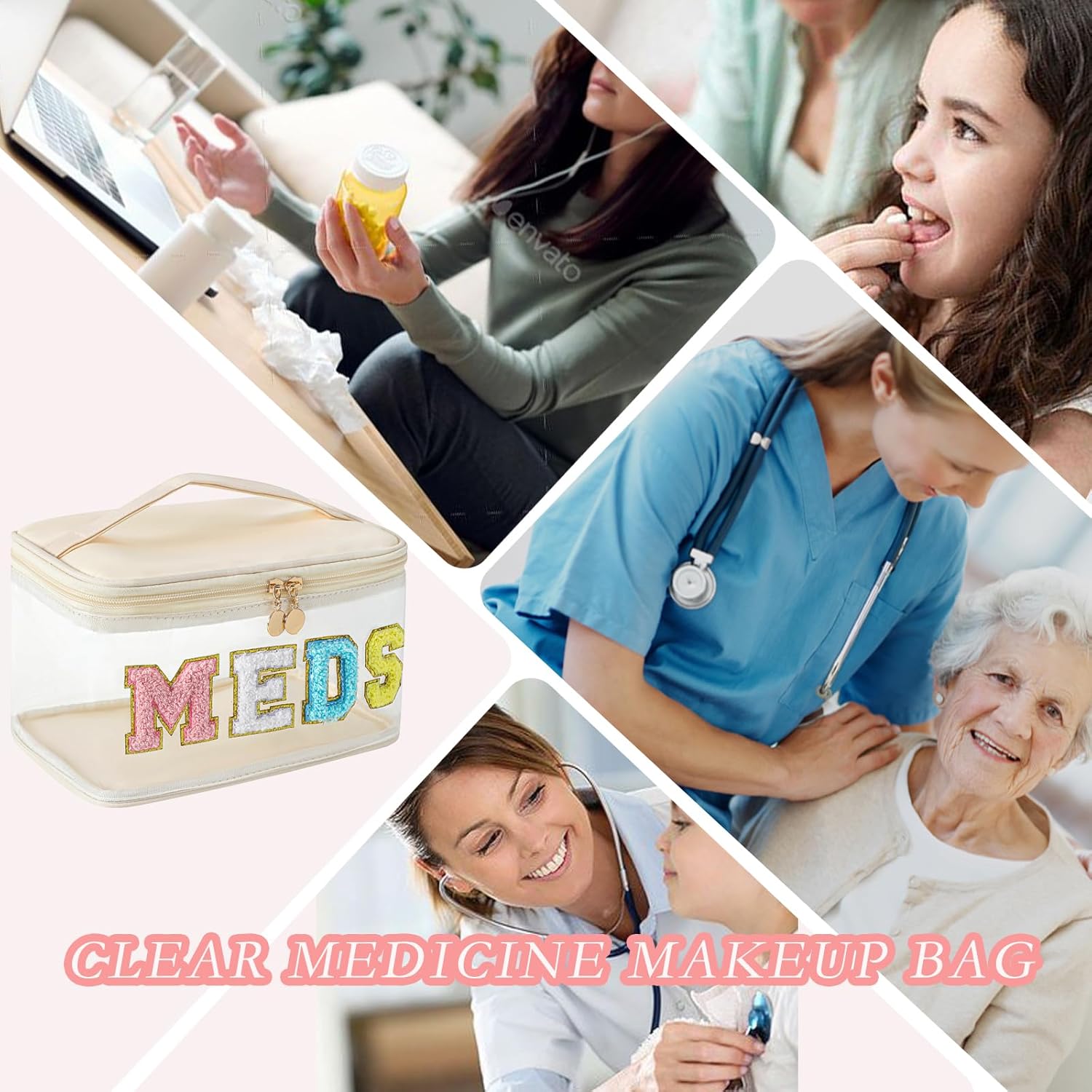 Chenille Letter Clear Medicine Makeup Bag, Large Size Waterproof Nylon Cosmetic Toiletry Storage bag with Top Handle, Transparent Meds First Aid Travel Organizer Cosmetic Bag(03Beige)