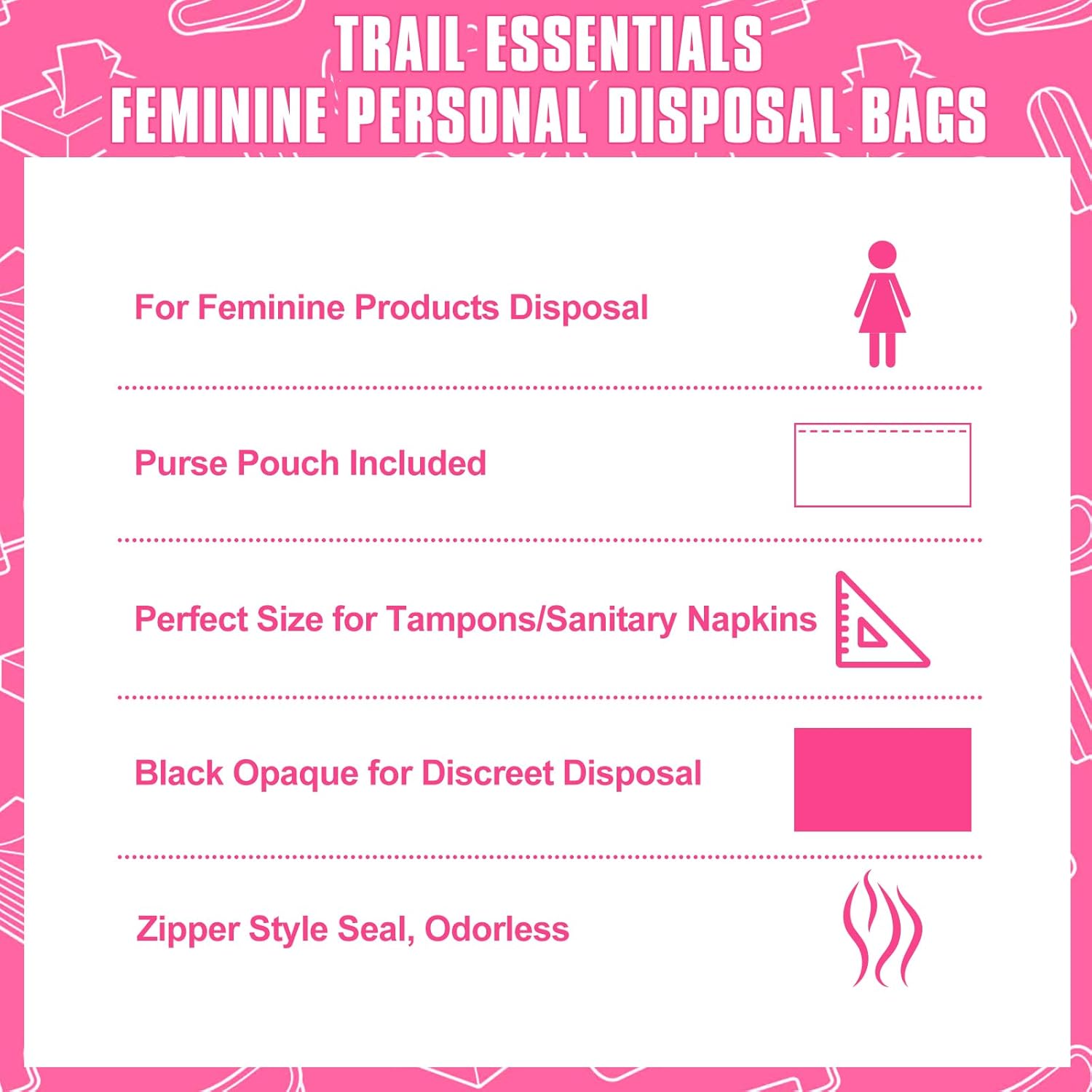 - WIDELY USED: Sanitary bags for feminine products can be used to hide personal items to isolate odours during menstruation, and can also be used as ordinary garbage bags to dispose of animal faeces, vomit, Suitable for hiking, outdoor, office and other occasions