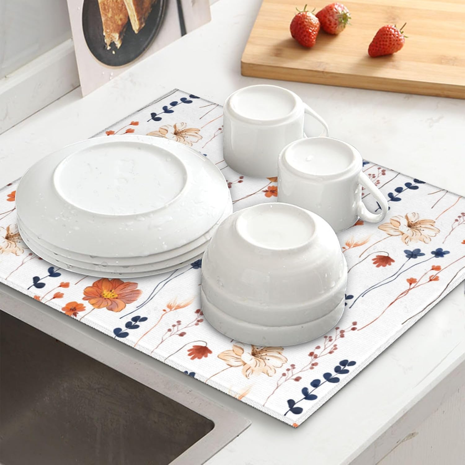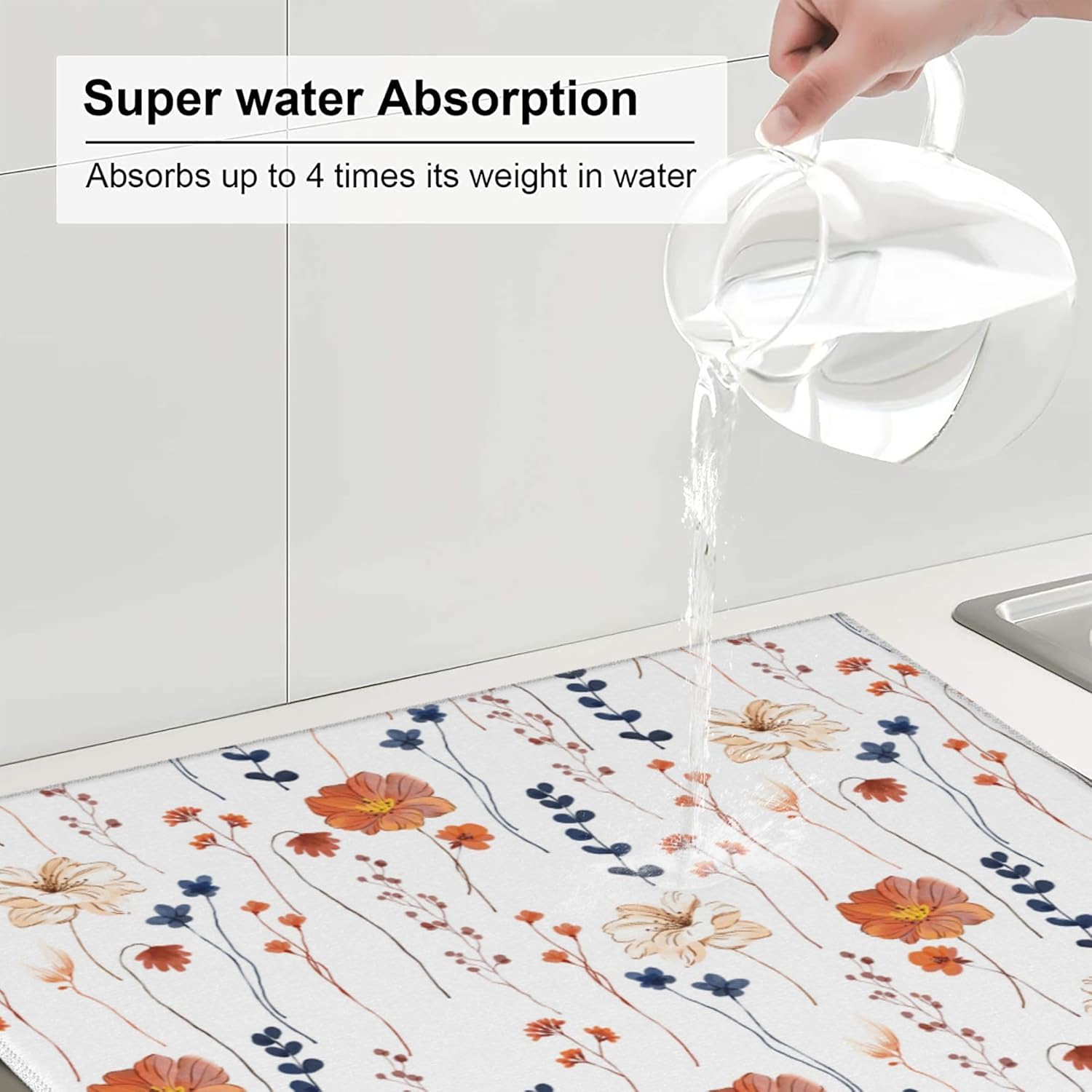 Watercolor Orange Floral Dish Drying Mat for Kitchen Counter Washable Absorbent Reversible Microfiber Orange Flower Decorative Drying Pad Kitchen Accessories 16"x18"