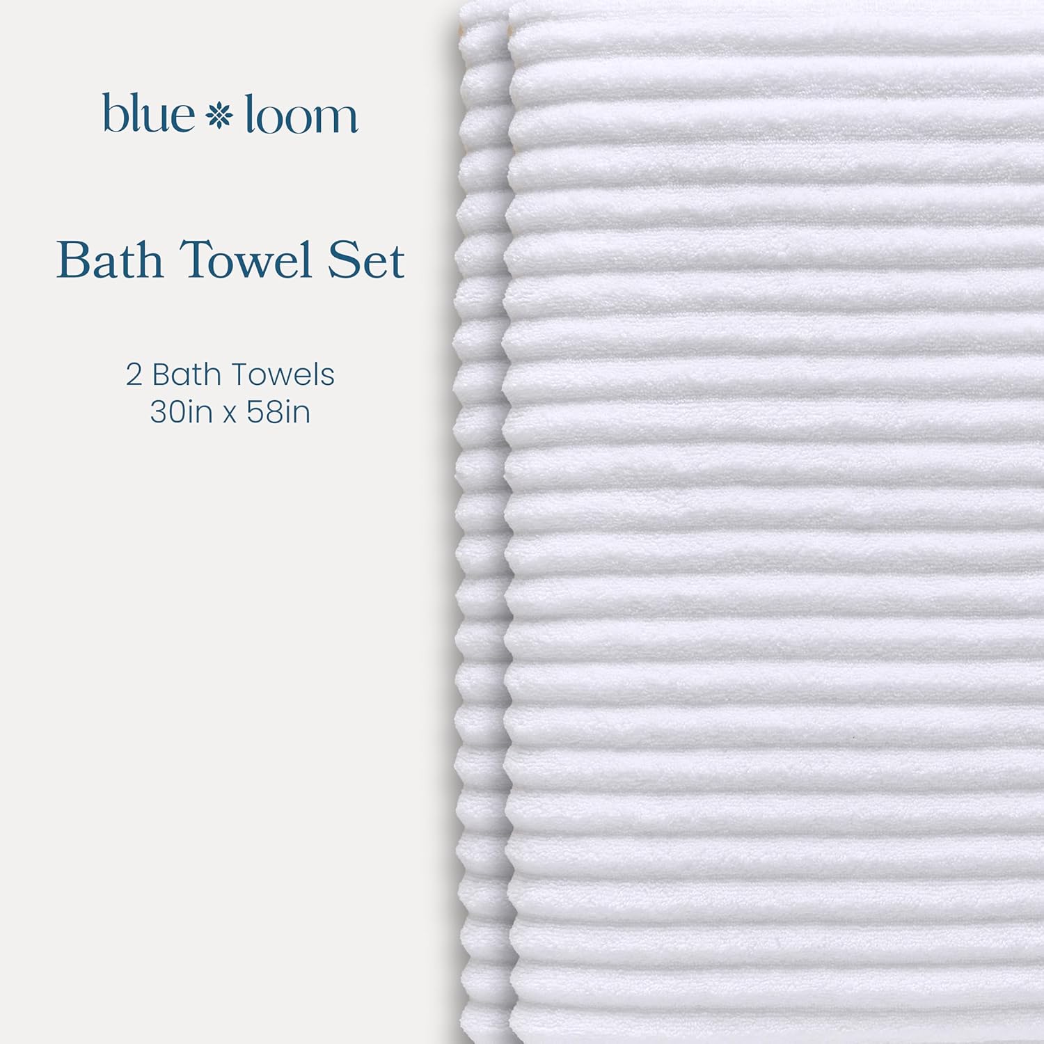 Blue Loom Ribbed Bath Towels Set, 100% Cotton 600 GSM, Soft Absorbent Durable Quick Drying 2 Bath Towels for Bathroom - Mason Set of 2 White (58" x 30" Inch)