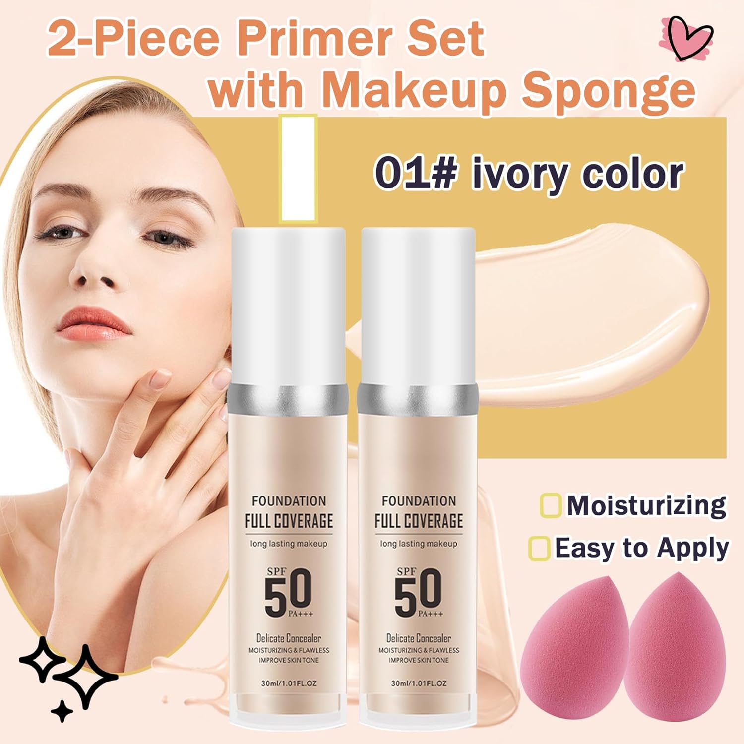 2PCS Ivory White Foundation Makeup Set with 2 Makeup Sponges,Moisturizing Full Coverage Liquid Foundation for Women,Non-greasy Long Lasting Flawless Concealer Cream Makeup Foundation Set
