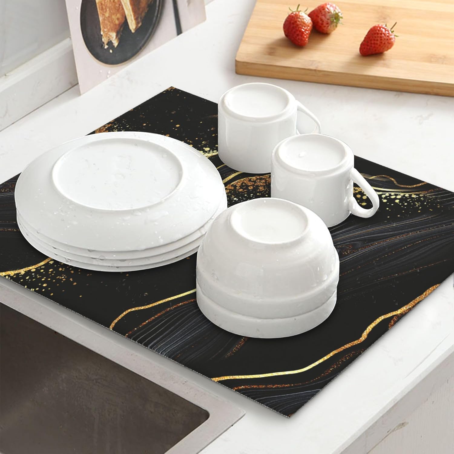 Black Gold Marble Texture Dish Drying Mat for Kitchen Counter Black Modern Decorative Dish Drainer Rack Mats 16x18 Inch Absorbent Reversible Drying Pad