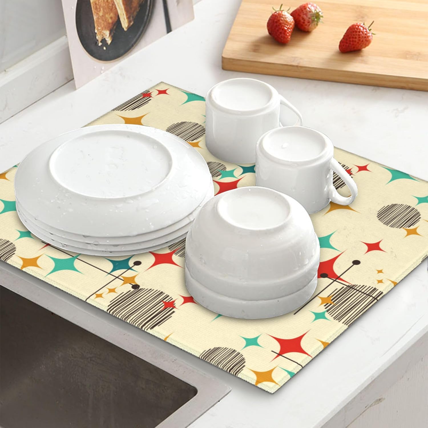 Mid Century Modern Atomic Retro Dish Drying Mat for Kitchen Counter Washable Absorbent Drying Mat Reversible Microfiber Yellow Drying Pad Home Holiday Decor Kitchen Accessories 16"x18"