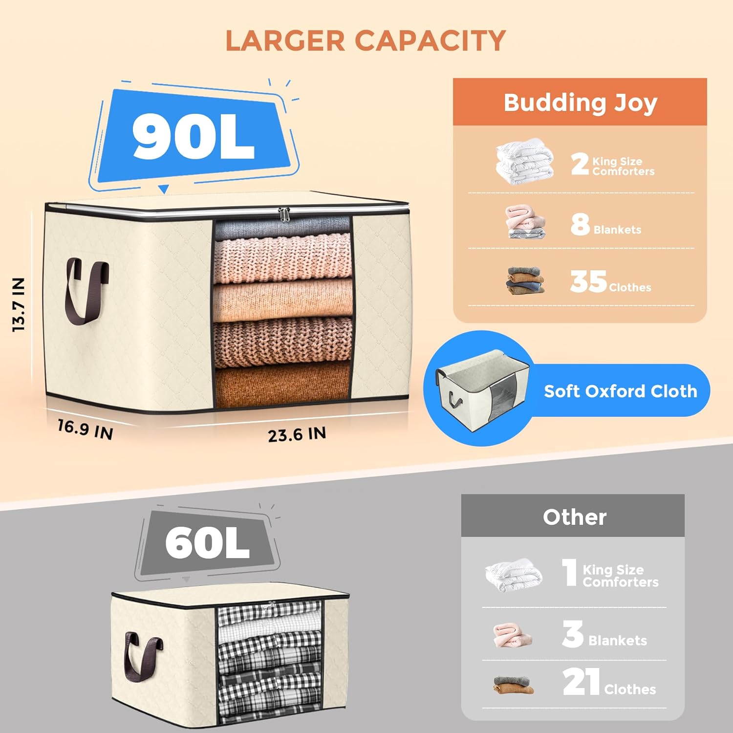 90 L Large Storage Bags, 4 Pack Clothes Storage Bins Foldable Closet Organizers Storage Containers with Reinforced Handle for Clothing, Blanket, Comforters, Bed Sheets, Pillows and Toys (Beige)