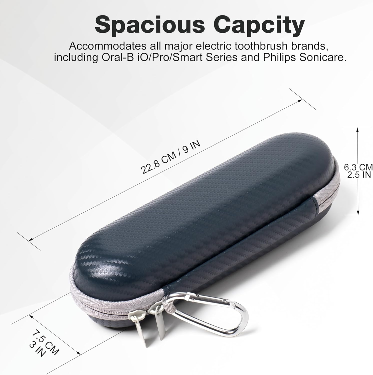 - Spacious Capacity: This toothbrush case boasts a larger size, accommodating all powered toothbrush products—including Oral-B iO, Pro, Smart Series, and Philips Sonicare. Its spacious design is perfect for storing your powered toothbrush, especially when you need to pack the iO series charger for travel. There's also ample room for extra brush heads, small toothpaste tubes, and mouthwash. If you prefer a more compact option, check out our smaller size below.
