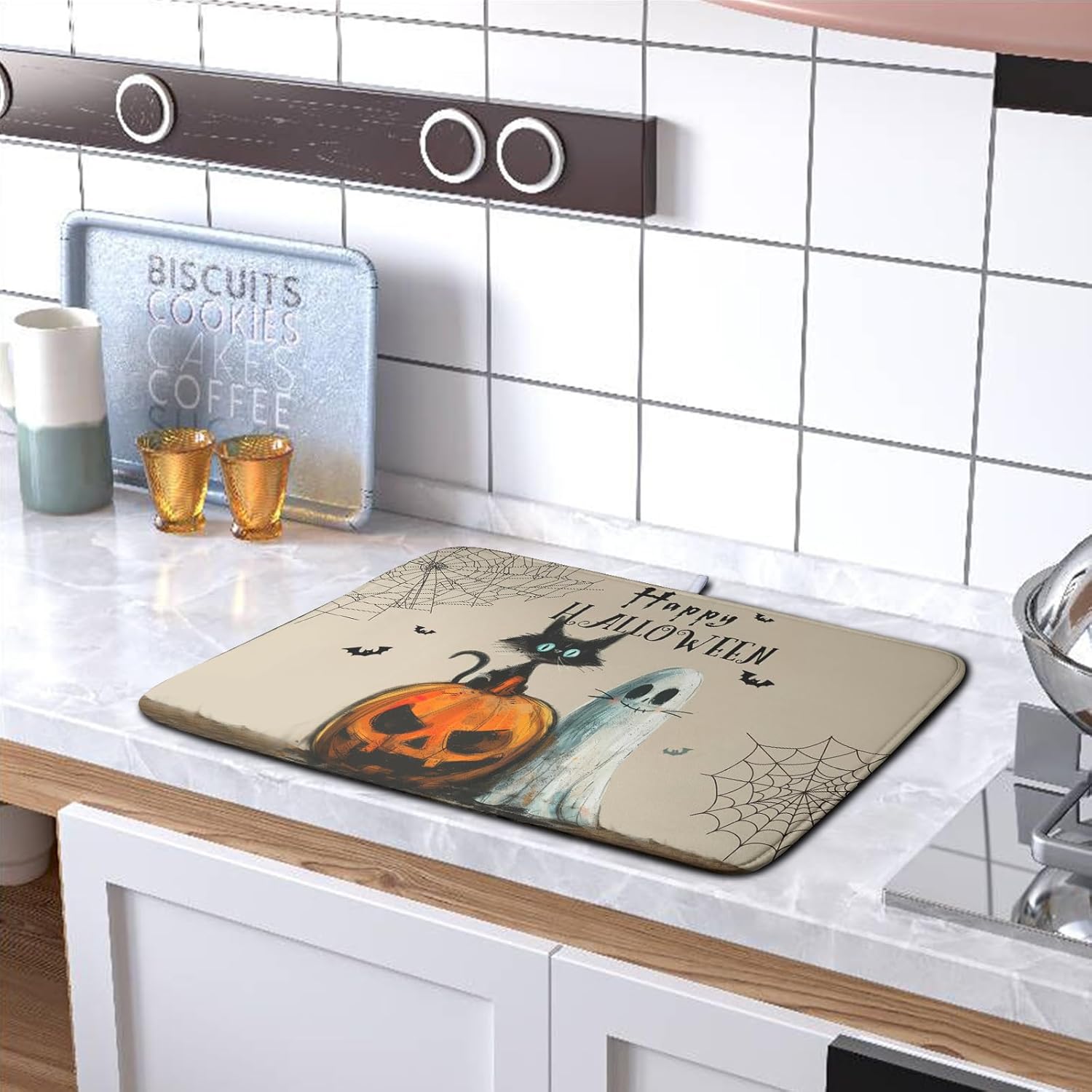 Happy Halloween Dish Drying Mat for Dishs 16x18 Inch Halloween Pumpkin Ghost Black Cat Kitchen Drying Mat Spooky Spiderweb Holiday Dish Drainer Mat Super Absorbent Dish Rack Pad for Coffee Bar Sinks