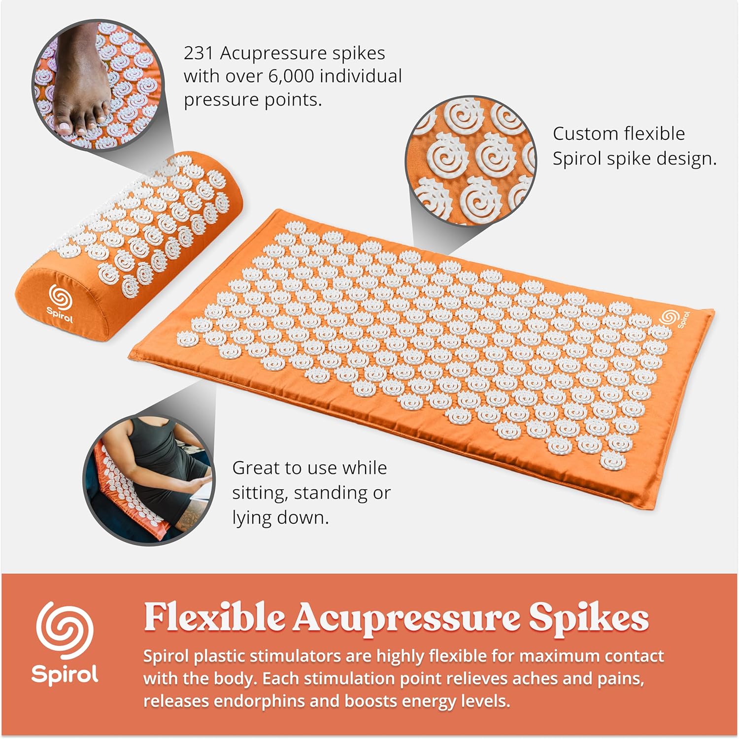 Spirol Acupressure Mat and Pillow Set for Back, Neck and Shoulder Pain Relief, with Flexible Acupressure Spikes, Includes Carry Bag (Orange)