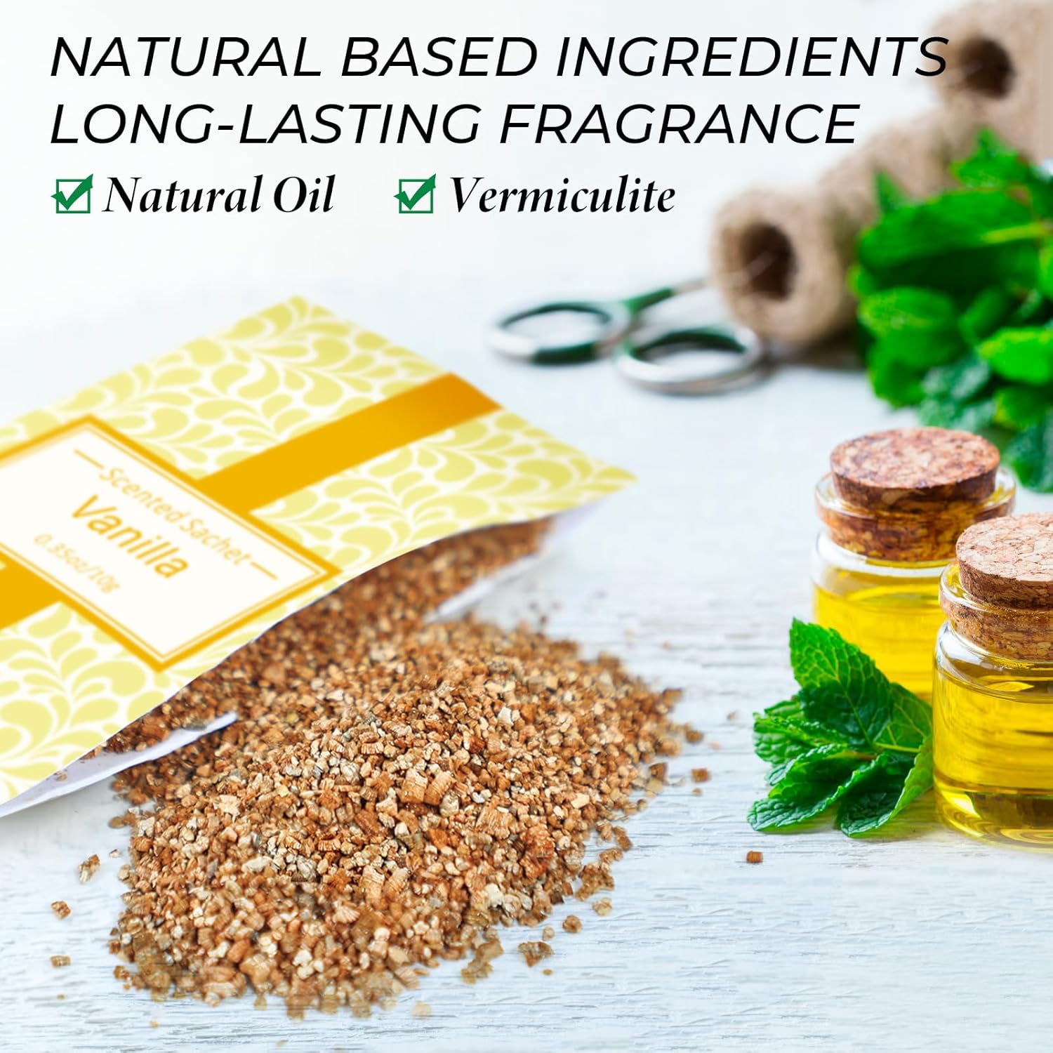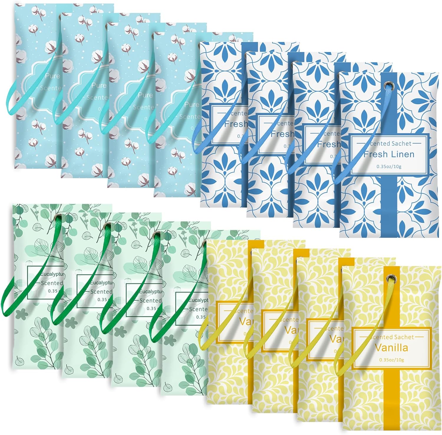 - Superior Quality : SCENTORINI Sachet made from only Natural and Organic quality vermiculite, add with high quality fresh fragrance sachets bags oils, With 16 sachets included, 4 scents, Linen Vanilla Cotton Eucalyptus & Sage