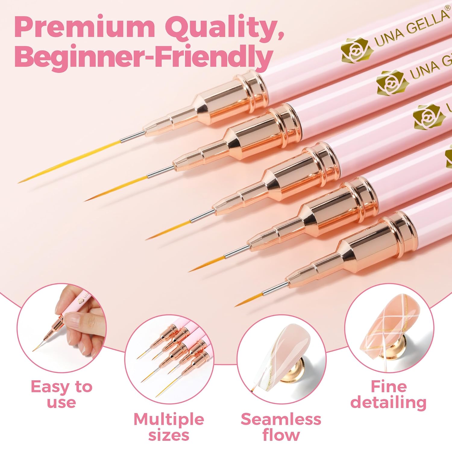 UNA GELLA Nail Art Brushes Metallic, 5 Count Liner Pens Set For Nail Art Gel Polish, Detail Nail Art Design Painting Brush Set For Nails Gel Fine Drawing Nail Tools, Sizes 7/9/11/15/25mm