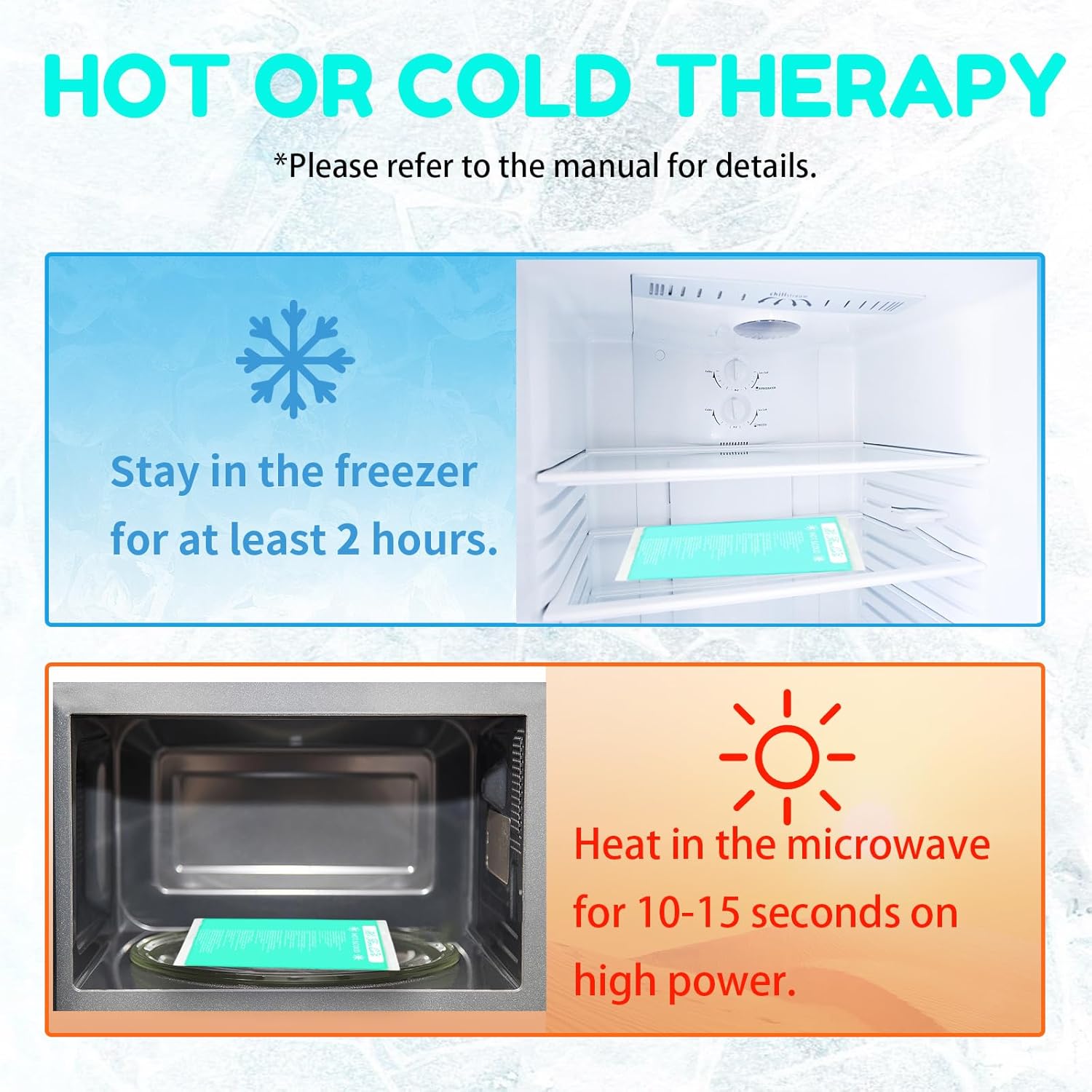 - EASY TO USE - Just a simple operation to achieve the effect. Place cold packs in the freezer for 20-30 minutes, or microwave within 12 seconds to reach desired temperature. Our casualty ice packs stay flexible when the ice pack freezes.