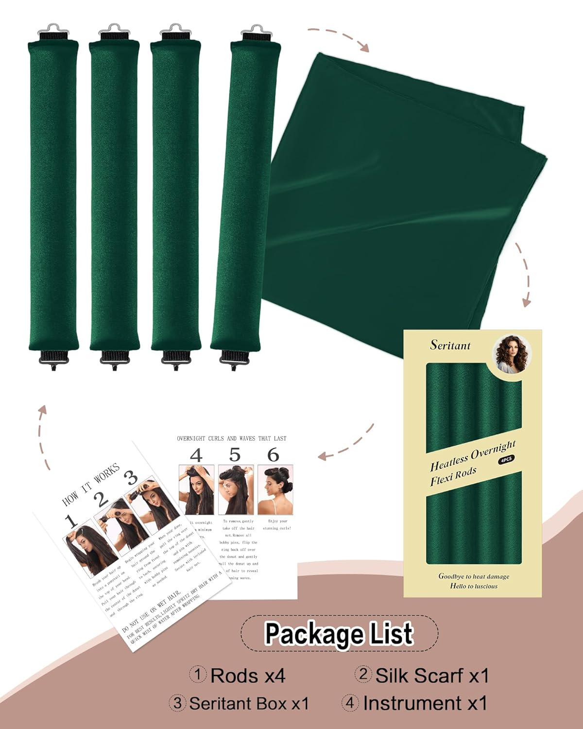 Heatless Curls Overnight Hair Curler - 4 Pcs Curling Rod to Sleep In, Velvet Hair Rollers with Satin Hair Scarf