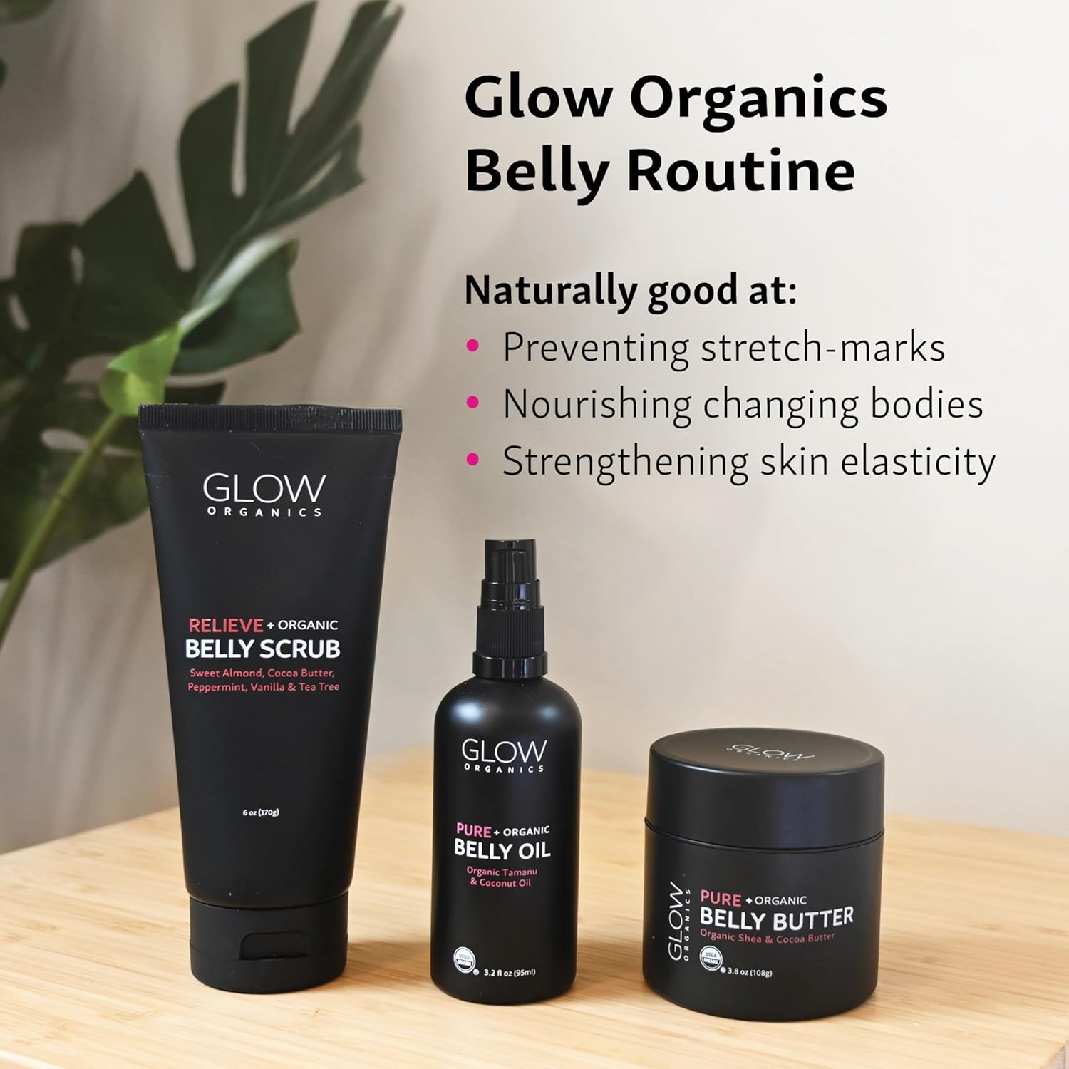 - ORGANIC PREGNANCY PRODUCTS: Glow Organics 3-Step Belly Routine Box includes the most popular Glow Organics products: Glow Organics Belly Scrub, Glow Organics Belly Butter and Glow Organics Belly Oil.