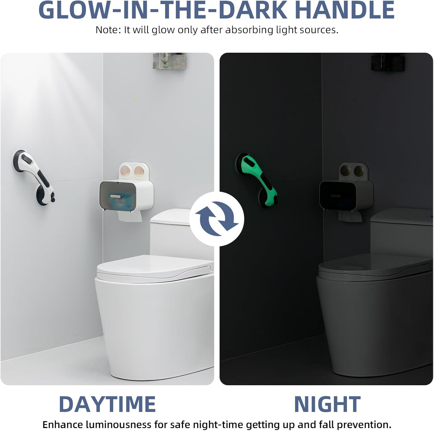 - Warm Tips: Please install this suction grip handle in place and whether it is firm enough before using, pay attention that the suction grab bars for shower ONLY sticks on the impervious and smooth surface, such as Glass, Ceramic Tile, Smooth Marble, Solid Wood Wall, Acrylic Board ect. To make it glow, simply place the shower handle in direct sunlight or under a bright light source during the day. DO NOT install this suction cup grab bar on the crack surface or the porous surface. Please don't put all the body on the shower grip