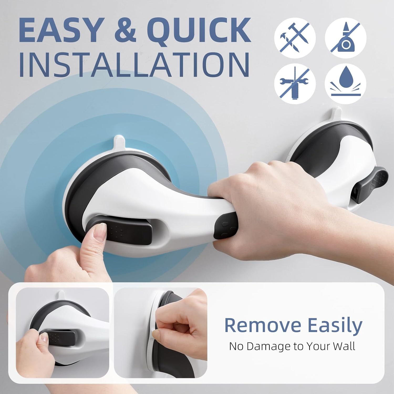 - No Drilling & Easy Installation and Remove: The grab bars only takes 5 seconds to install, even the elderly can easily complete the installation.With no drilling and no hardware,you can install this grip shower handle on your bathroom easily. The safety handles can be removed without damage to the wall. The shower bars for elderly suction can be used repeatedly after dismantling and washing