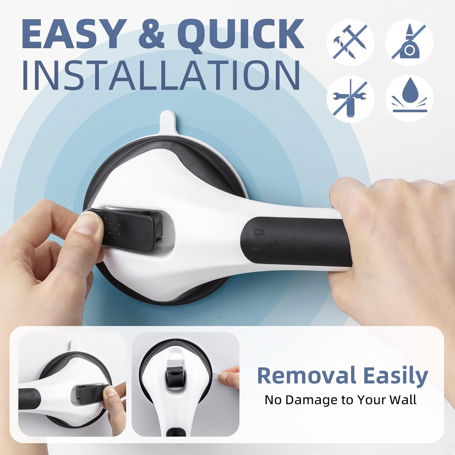 - No Drilling & Easy Installation and Remove: The grab bars only takes 5 seconds to install, even the elderly can easily complete the installation.With no drilling and no hardware,you can install this grip shower handle on your bathroom easily. The safety handles can be removed without damage to the wall. The shower bars for elderly suction can be used repeatedly after dismantling and washing