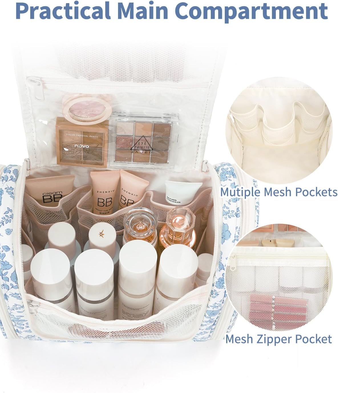 Narwey Hanging Toiletry Bag for Women Travel Makeup Bag Organizer Toiletries Bag for Cosmetics Essentials Accessories (Large, Little Blue Flower)