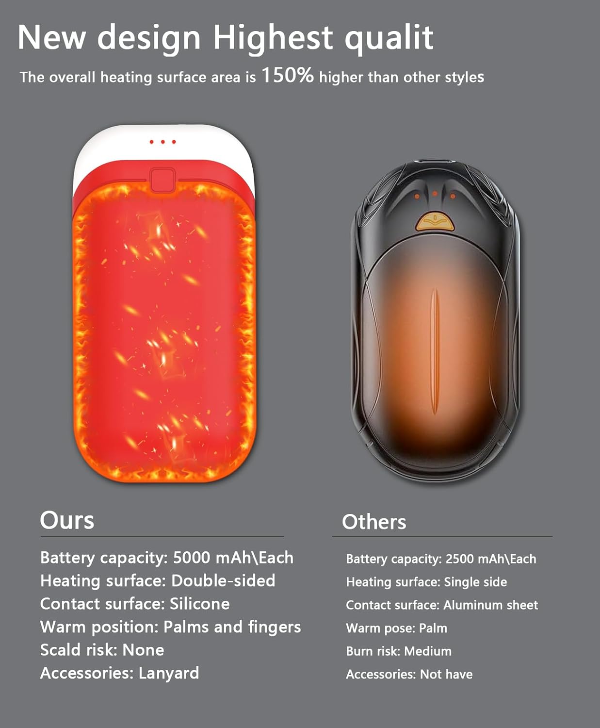 - 【Double-side heating】:Double-sided heating aluminum sheet combined with heat-conducting silicone achieves 360 ° heating surface, minimum 104 ℉ - maximum 131 ℉. Warm your entire palm and fingers, 5000mAh X 2 Packs keep you warm for up to 7-20 hours in cold winter