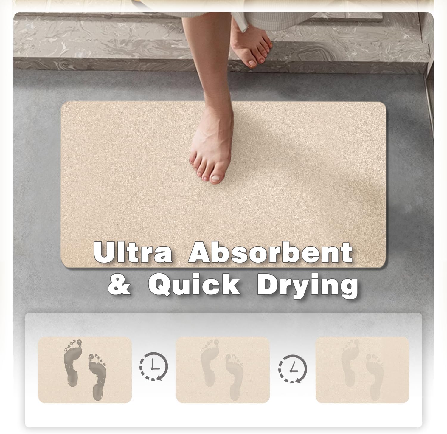 - Fast Absorbing & Quick Drying: Our bathroom rug absorbs water instantly as you step out of the shower or bathtub. In just a few minutes, it’s completely dry, with no watermarks left behind. The mat dries quickly, so your floor stays clean and dry