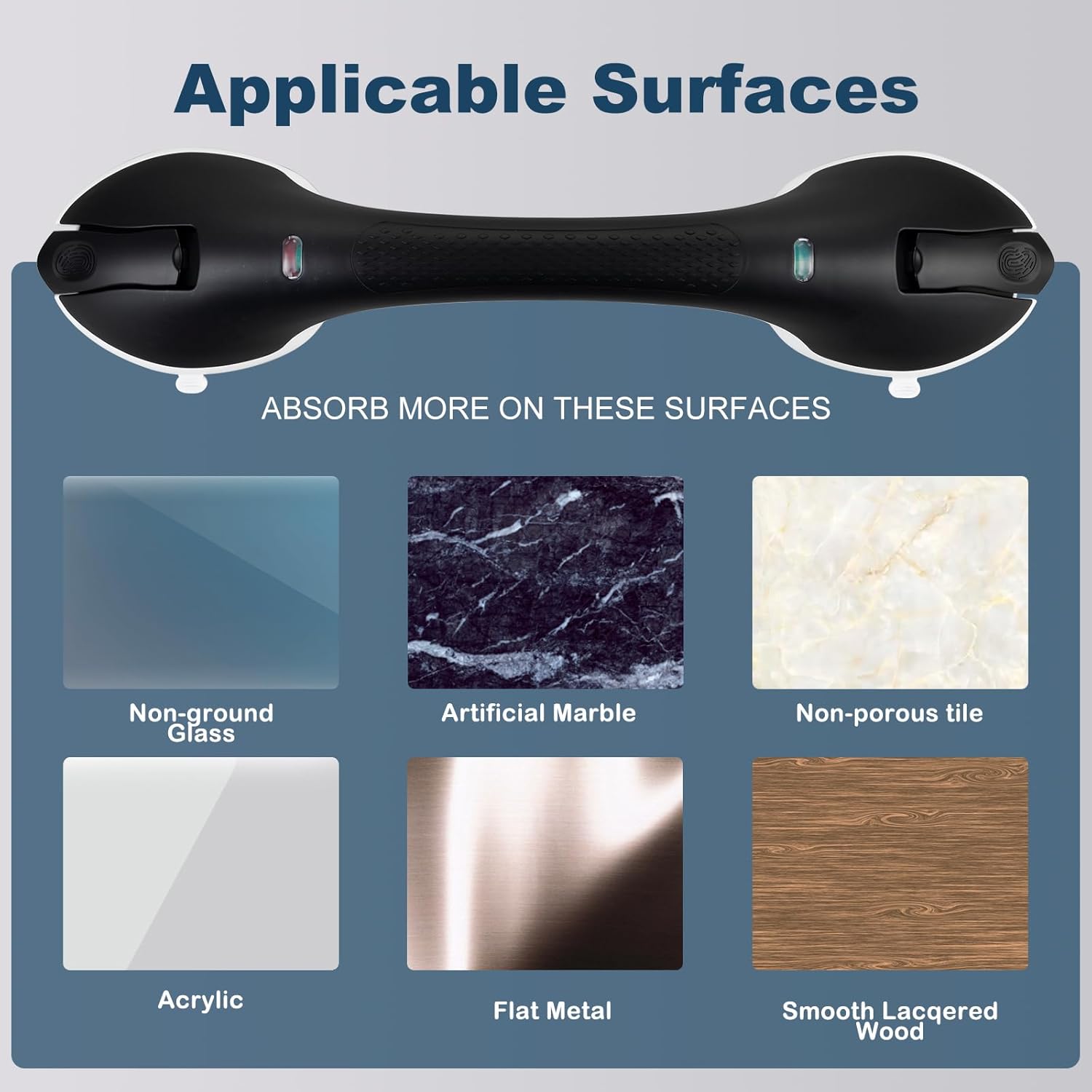 - 💥【Usage method】①Clean the Surface :Thoroughly clean and dry the installation surface using alcohol or a mild cleaner.②Check the Suction Cups: Ensure that the suction cups are not damaged or aged; replace them if necessary.③Press to Install: Align the grab bar with the installation position and press firmly to ensure the suction cups adhere completely to the surface.④Test Stability: Gently pull on the grab bar to ensure it is securely attached to the surface.o.