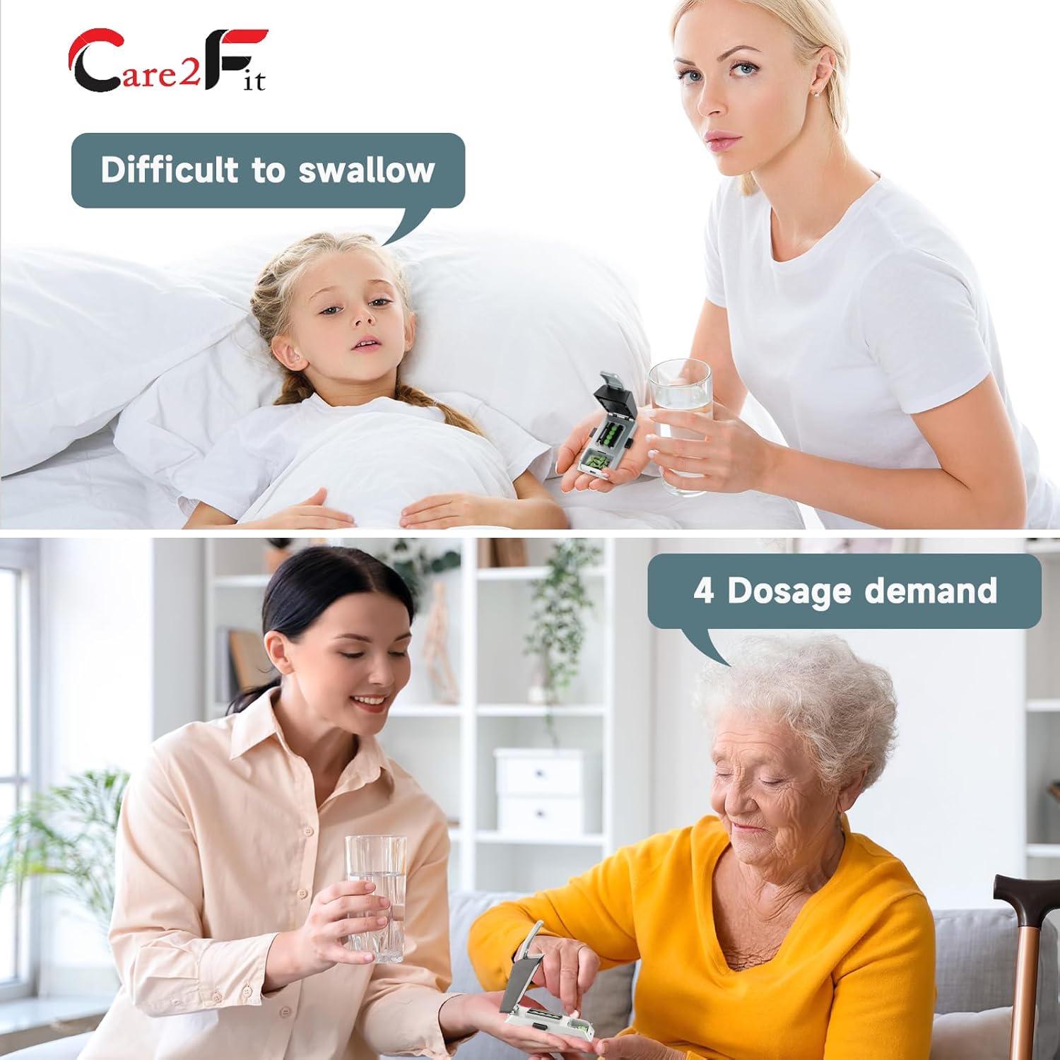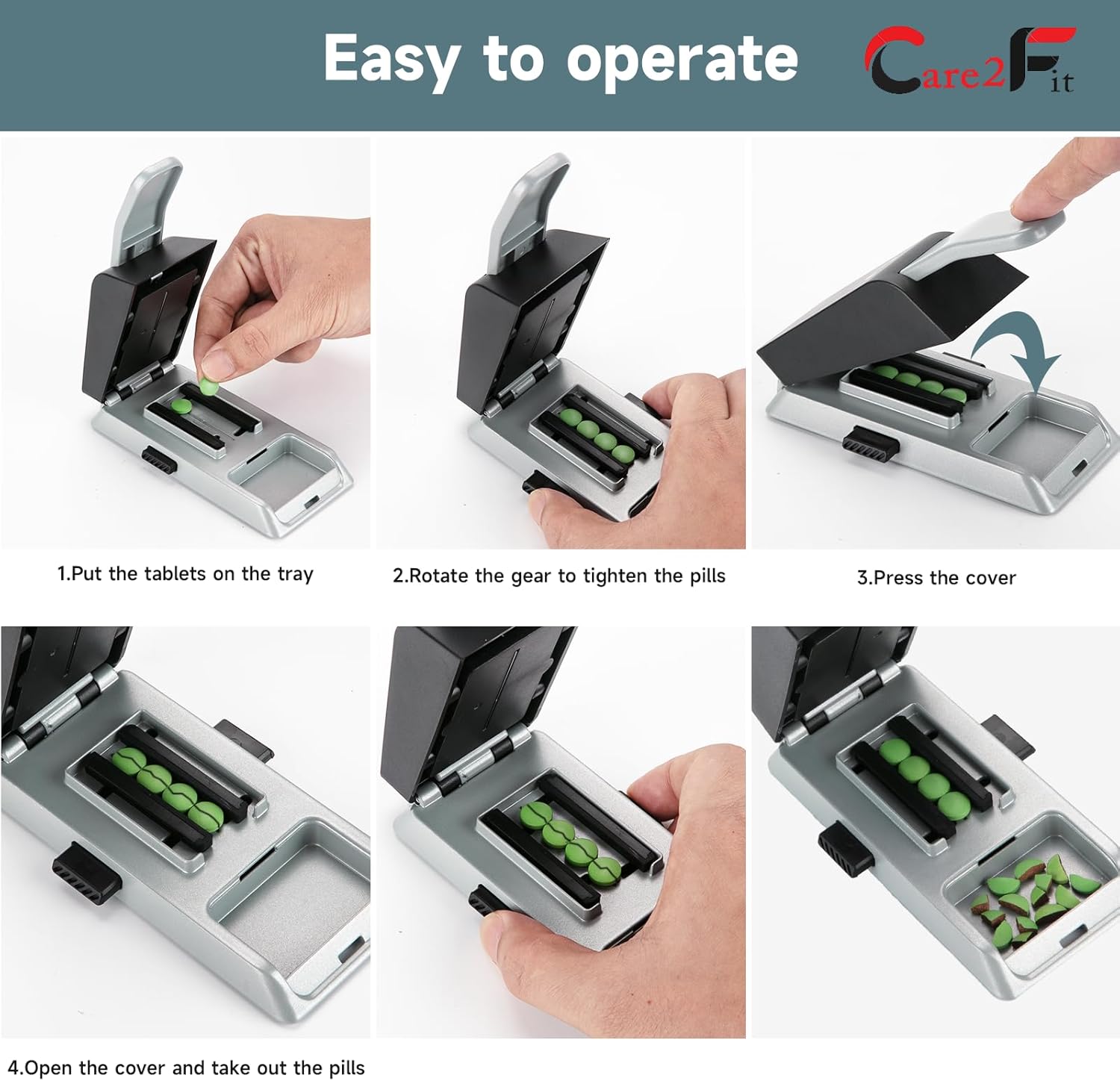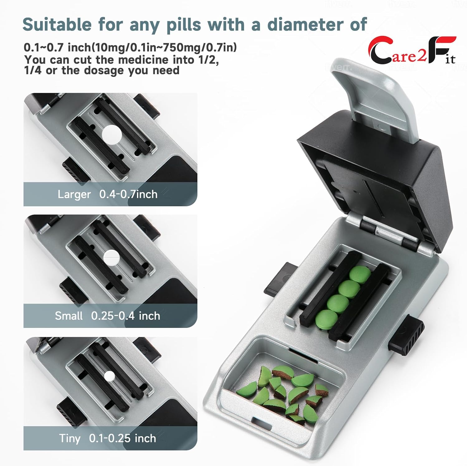 - 【Multiple sizes pill cutter】The Care2fit pill cutter linkage device can quickly center,accuracy split multiple pills at once.Our Care2fit pill cutter can safely accommodate pills of any size, round, rectangular or oval. This pill cutter splitter for small and tiny pills can cut pills with a width of 2mm-15mm, so it can easily cut tiny pills of 2.5mg.
