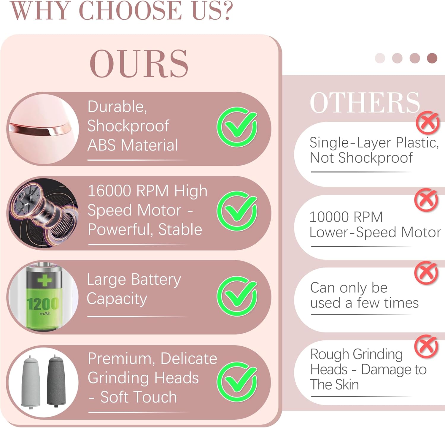 - Upgraded Powerful Motor: Powered by an upgraded, high-speed motor, this electric foot callus remover delivers smooth, powerful, and pain-free performance, safely and effortlessly eliminating tough calluses and dry skin. Treat yourself to a relaxing foot spa experience at home.