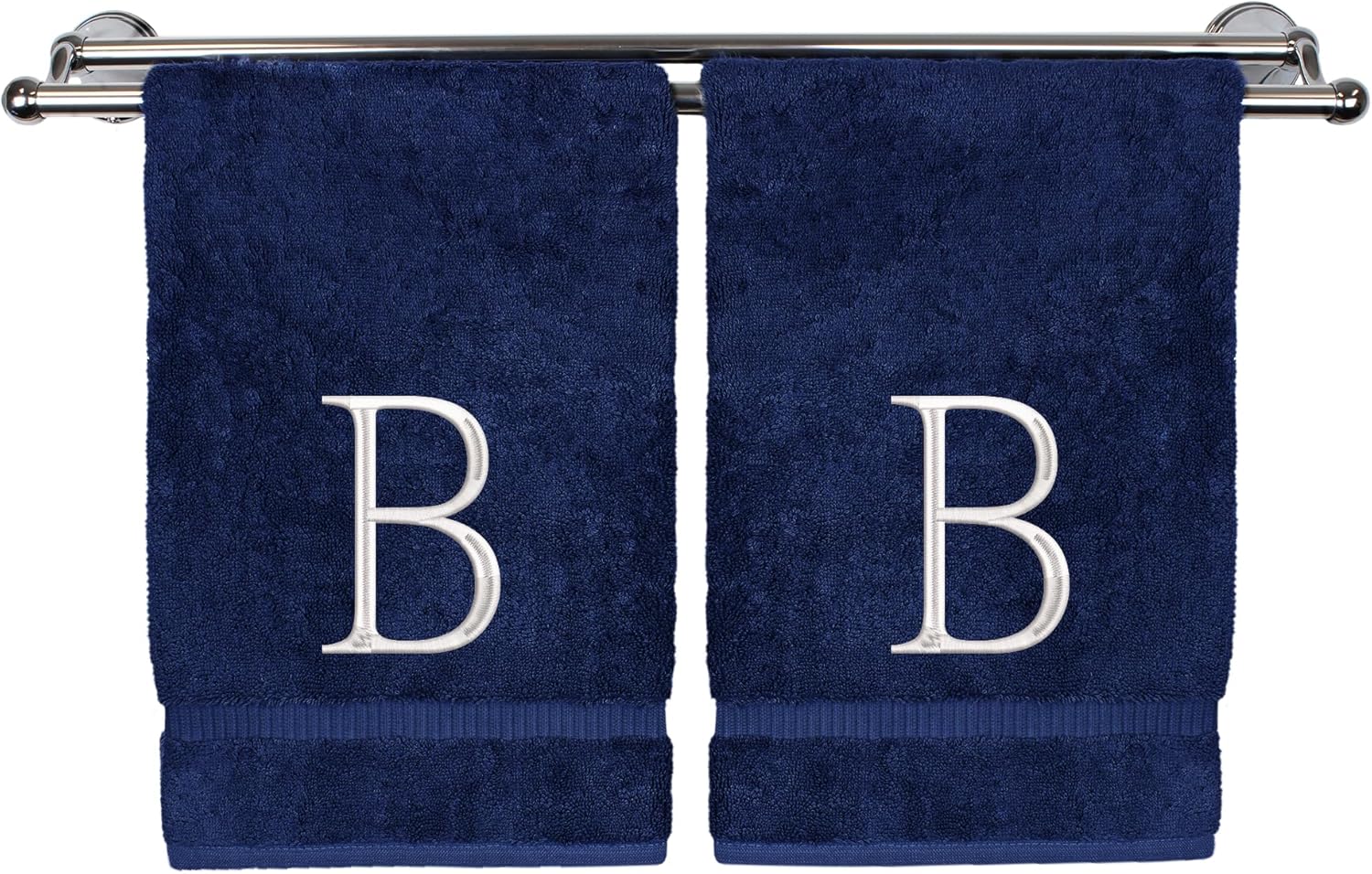 Monogrammed Hand Towel, Personalized Initial Gift, Extra Absorbent 100% Turkish Cotton - Soft Terry Finish - Set of 2 - White Block Initial B - Embroidered on Navy Blue Towels