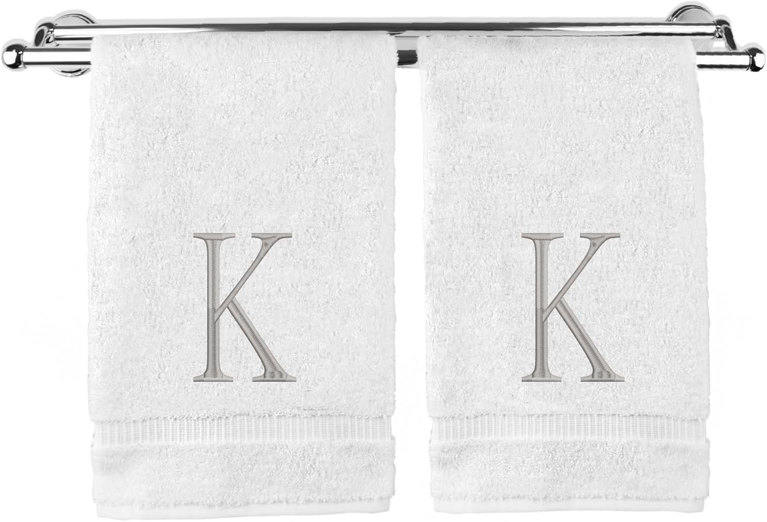Monogrammed Hand Towel, Personalized Initial Gift, Extra Absorbent 100% Turkish Cotton - Soft Terry Finish - Set of 2 - Silver Block Initial K - Embroidered on White Towels