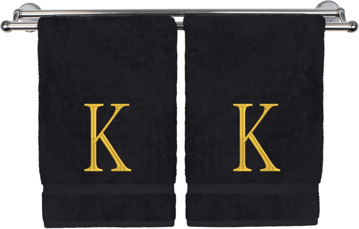 Monogrammed Hand Towel, Personalized Initial Gift, Extra Absorbent 100% Turkish Cotton - Soft Terry Finish - Set of 2 - Gold Block Initial K - Embroidered on Black Towels