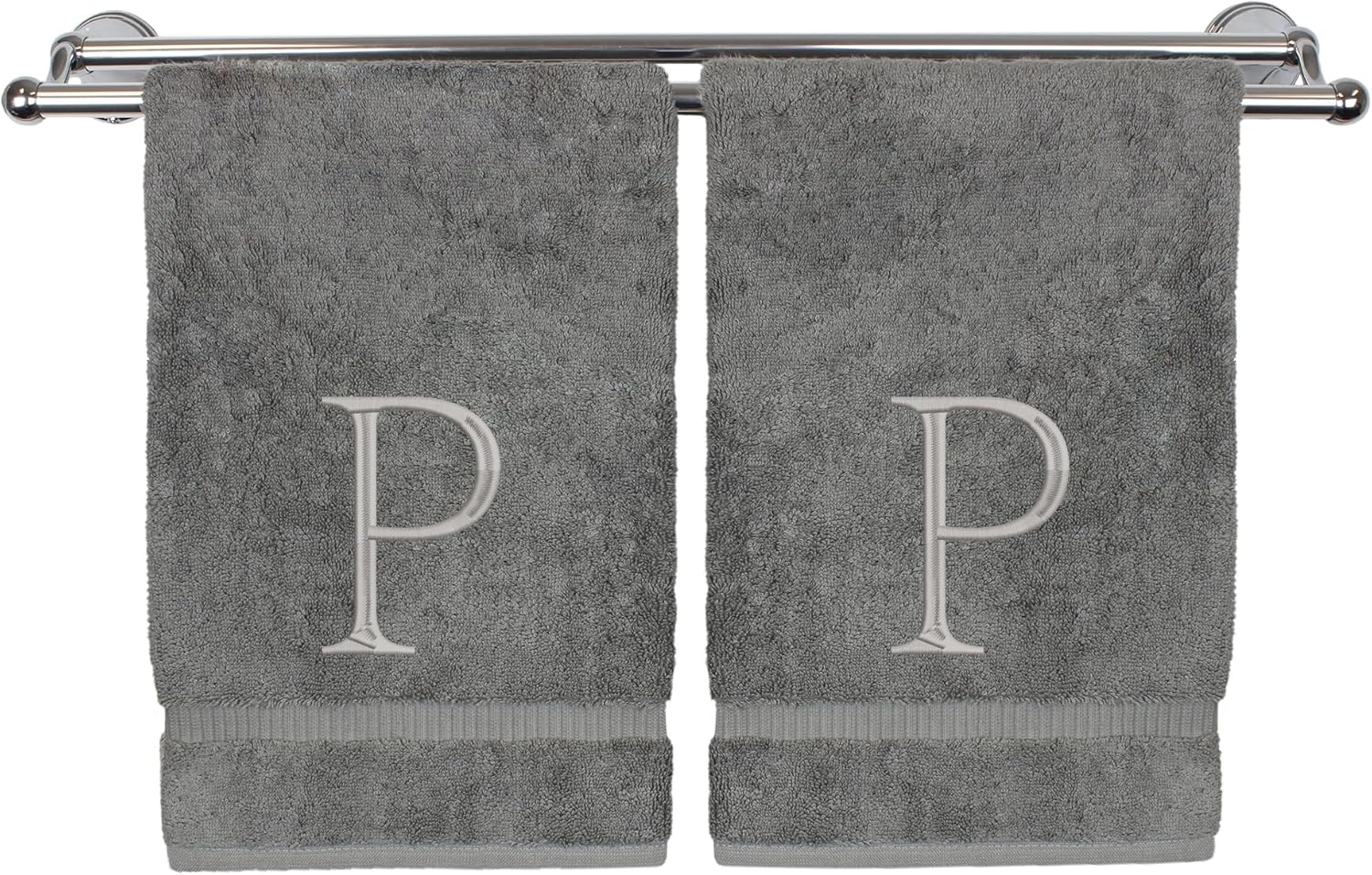 Monogrammed Hand Towel, Personalized Initial Gift, Extra Absorbent 100% Turkish Cotton - Soft Terry Finish - Set of 2 - Silver Block Initial P - Embroidered on Grey Towels