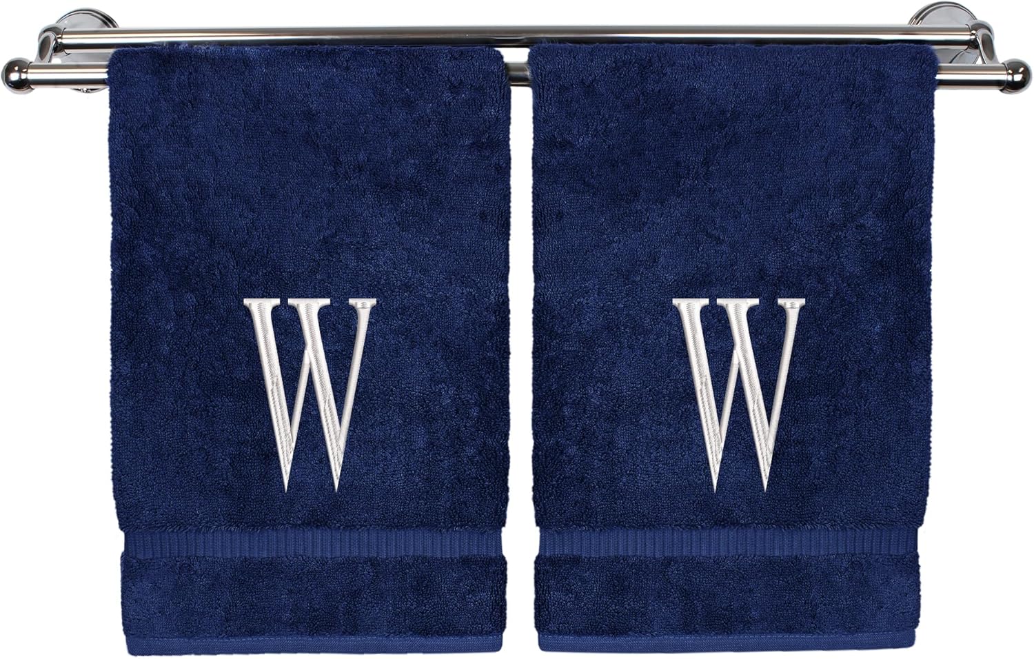 Monogrammed Hand Towel, Personalized Initial Gift, Extra Absorbent 100% Turkish Cotton - Soft Terry Finish - Set of 2 - White Block Initial W - Embroidered on Navy Blue Towels