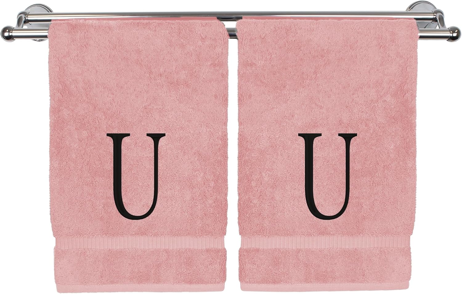 Monogrammed Hand Towel, Personalized Initial Gift, Extra Absorbent 100% Turkish Cotton - Soft Terry Finish - Set of 2 - Black Block Initial U - Embroidered on Pink Towels