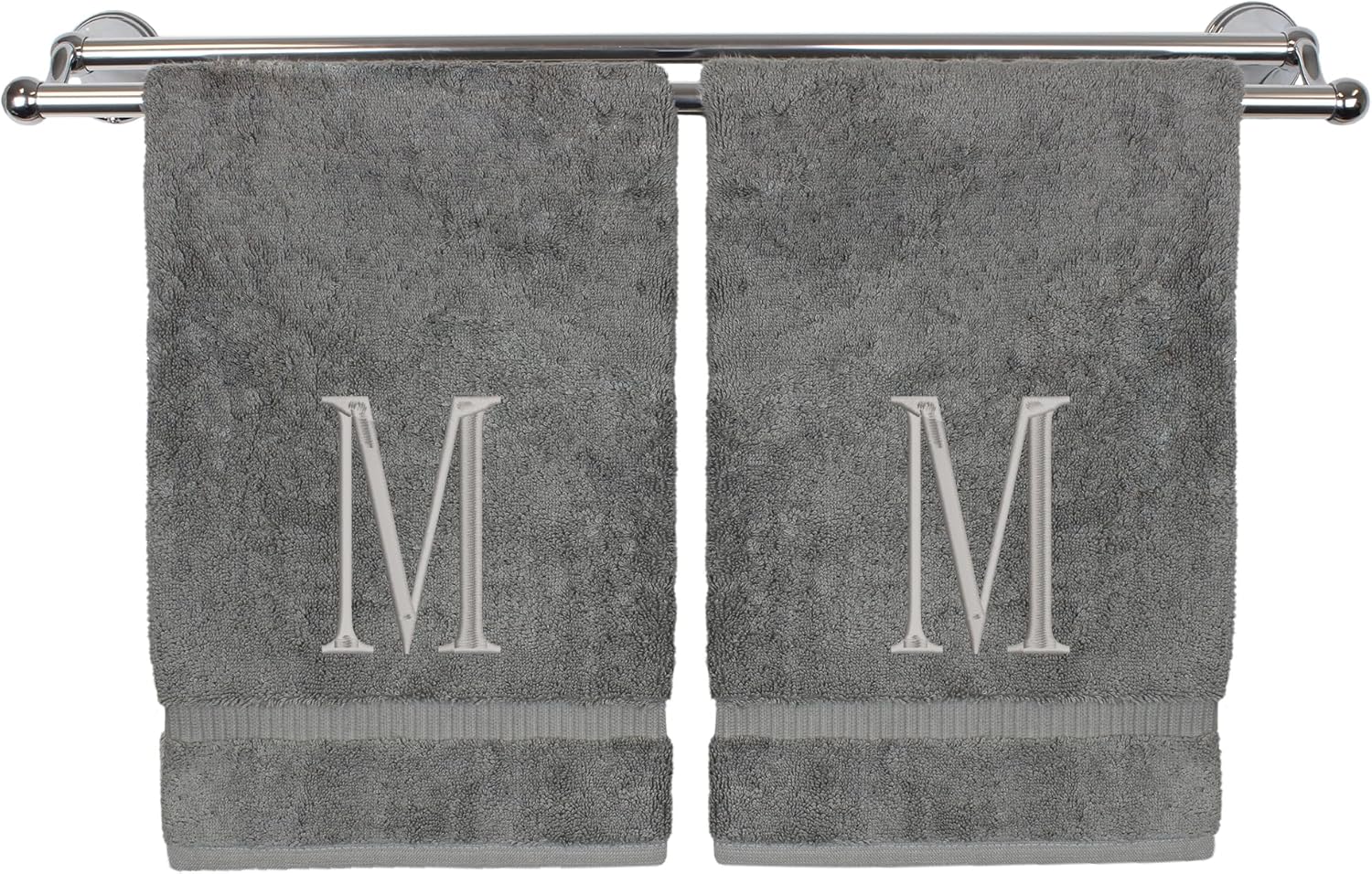 Monogrammed Hand Towel, Personalized Initial Gift, Extra Absorbent 100% Turkish Cotton - Soft Terry Finish - Set of 2 - Silver Block Initial M - Embroidered on Grey Towels