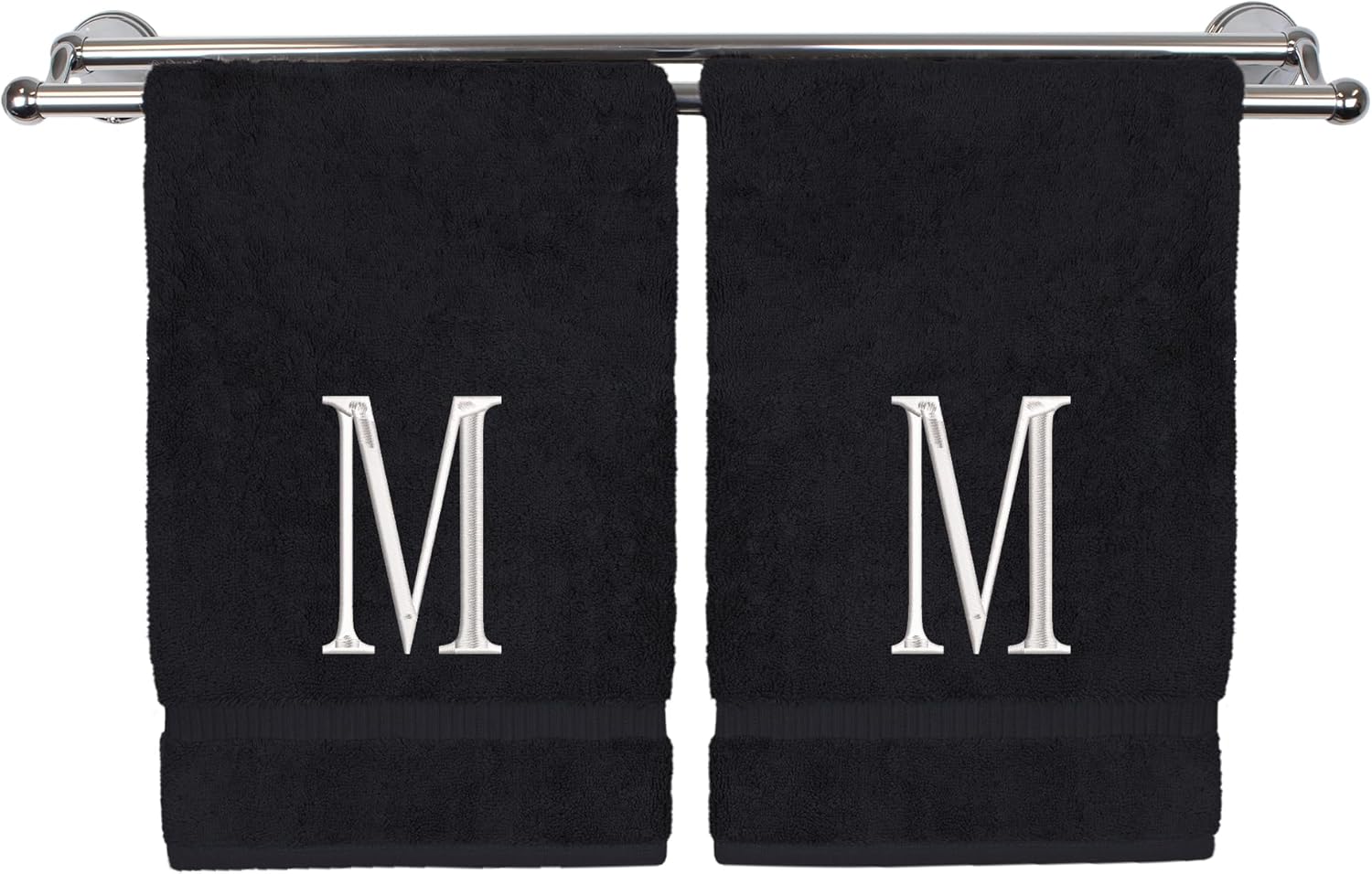 Monogrammed Hand Towel, Personalized Initial Gift, Extra Absorbent 100% Turkish Cotton - Soft Terry Finish - Set of 2 - White Block Initial M - Embroidered on Black Towels