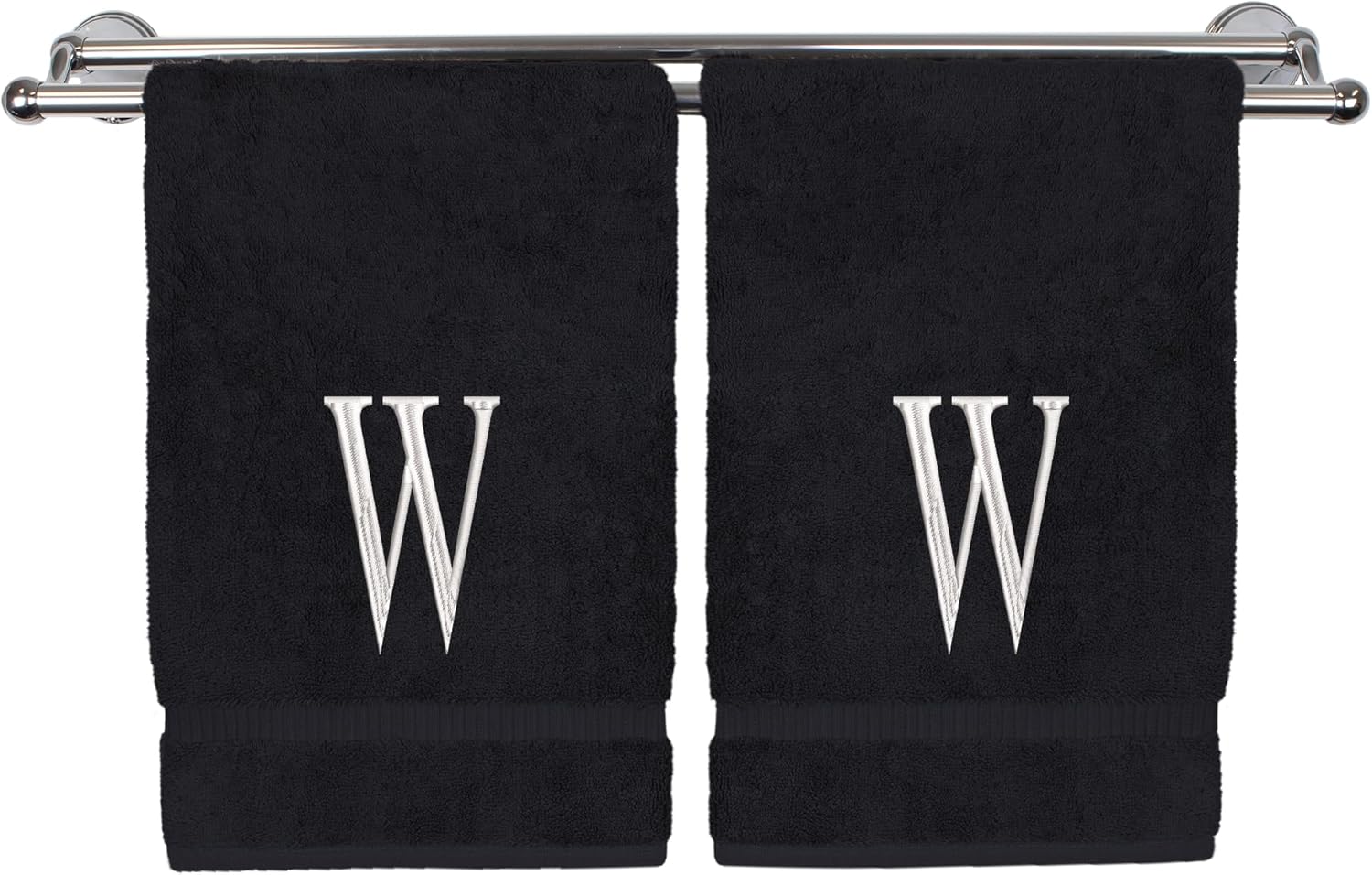 Monogrammed Hand Towel, Personalized Initial Gift, Extra Absorbent 100% Turkish Cotton - Soft Terry Finish - Set of 2 - White Block Initial W - Embroidered on Black Towels