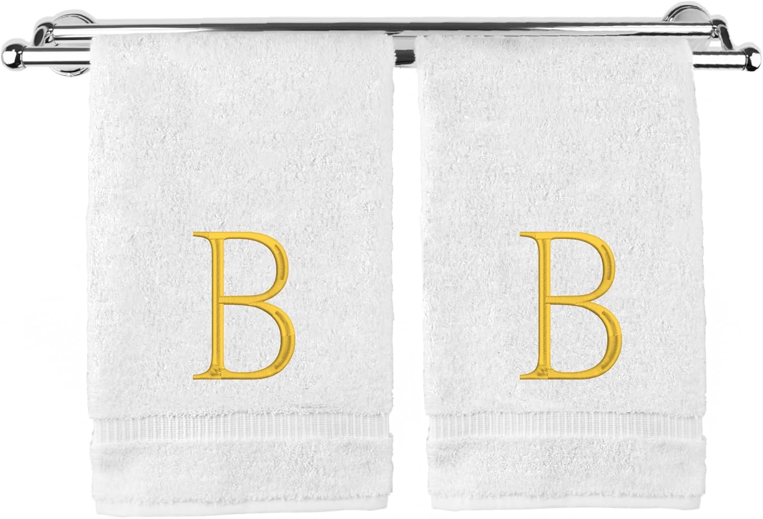 Monogrammed Hand Towel, Personalized Initial Gift, Extra Absorbent 100% Turkish Cotton - Soft Terry Finish - Set of 2 - Gold Block Initial B - Embroidered on White Towels