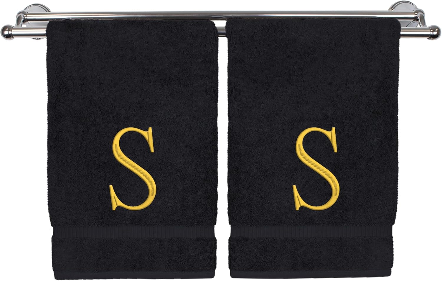 Monogrammed Hand Towel, Personalized Initial Gift, Extra Absorbent 100% Turkish Cotton - Soft Terry Finish - Set of 2 - Gold Block Initial S - Embroidered on Black Towels